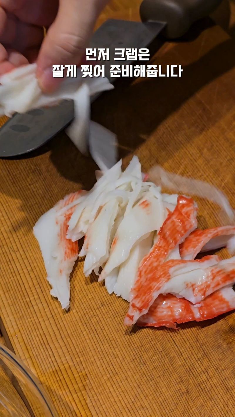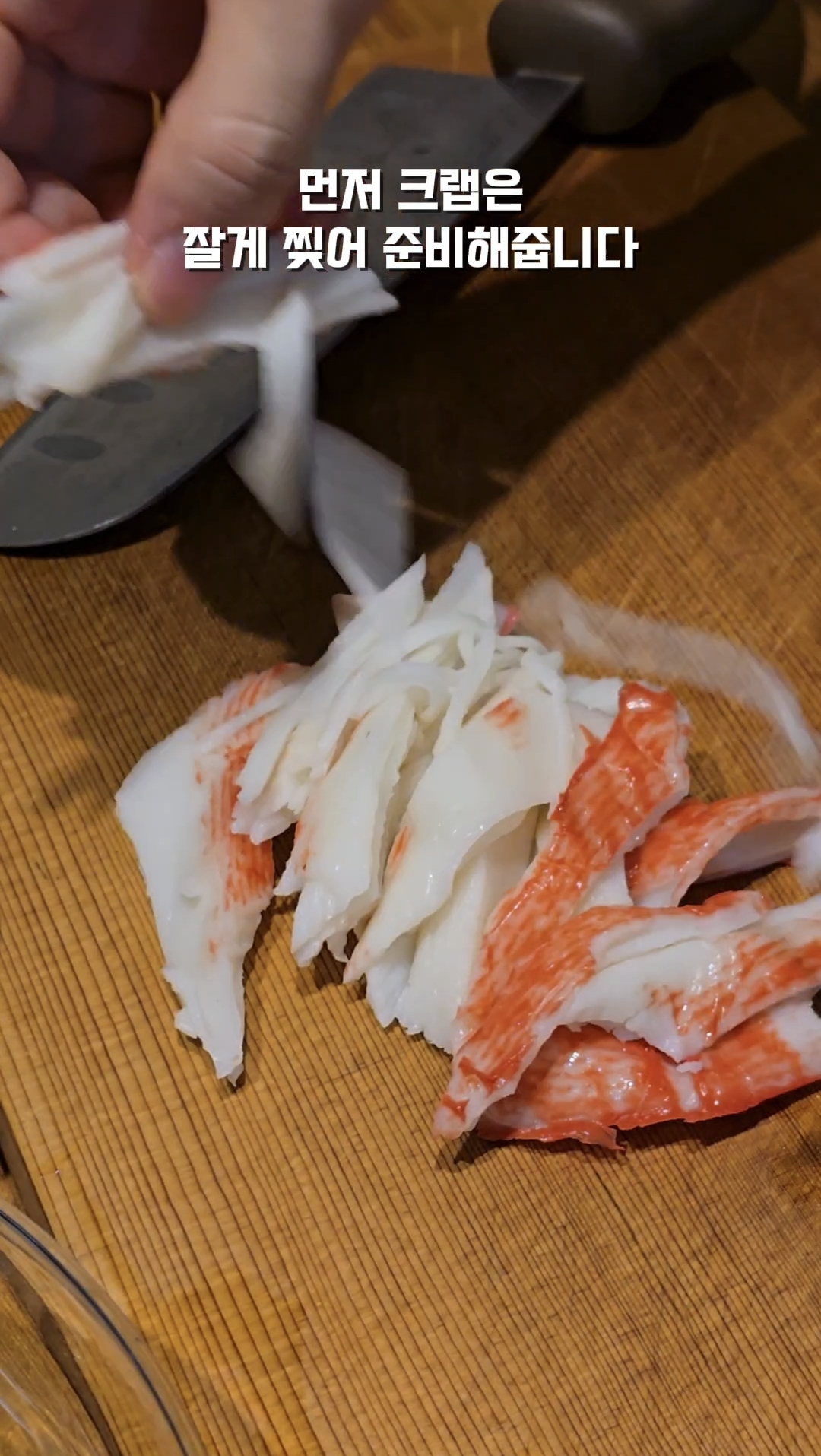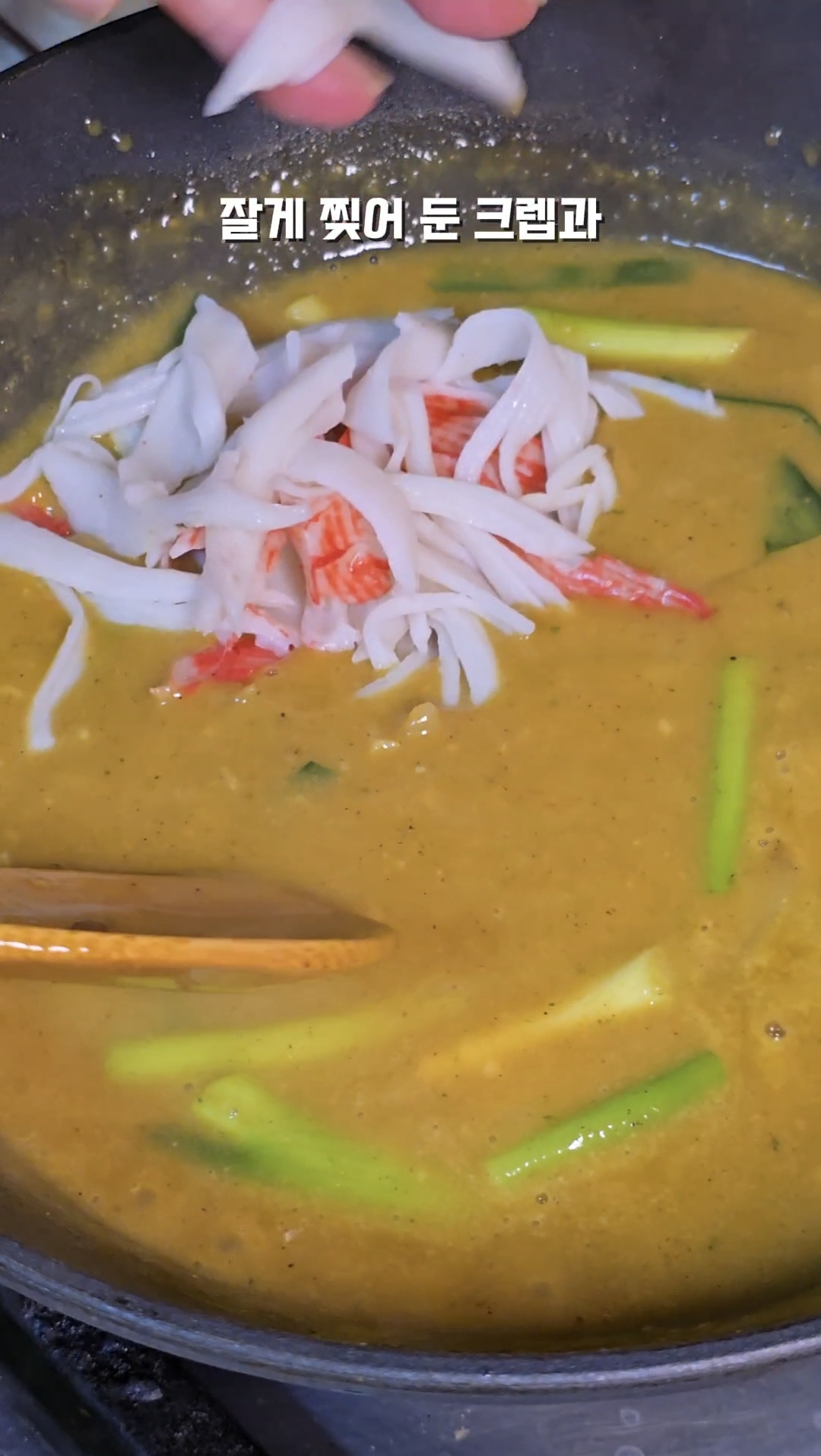 4. 잘게 찢은 크랩과 달걀물 넣어 뭉근히 계속 끓여줍니다.