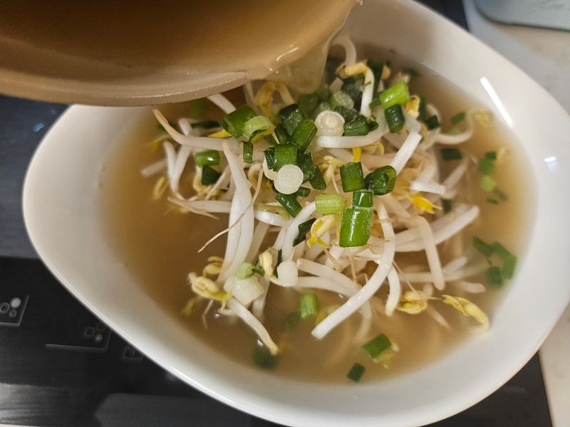 6. 4의 그릇에 담아놓은 면 위에 숙주, 쪽파를 올린 후 팔팔 끓인 육수를 부어 쌀국수 완성!