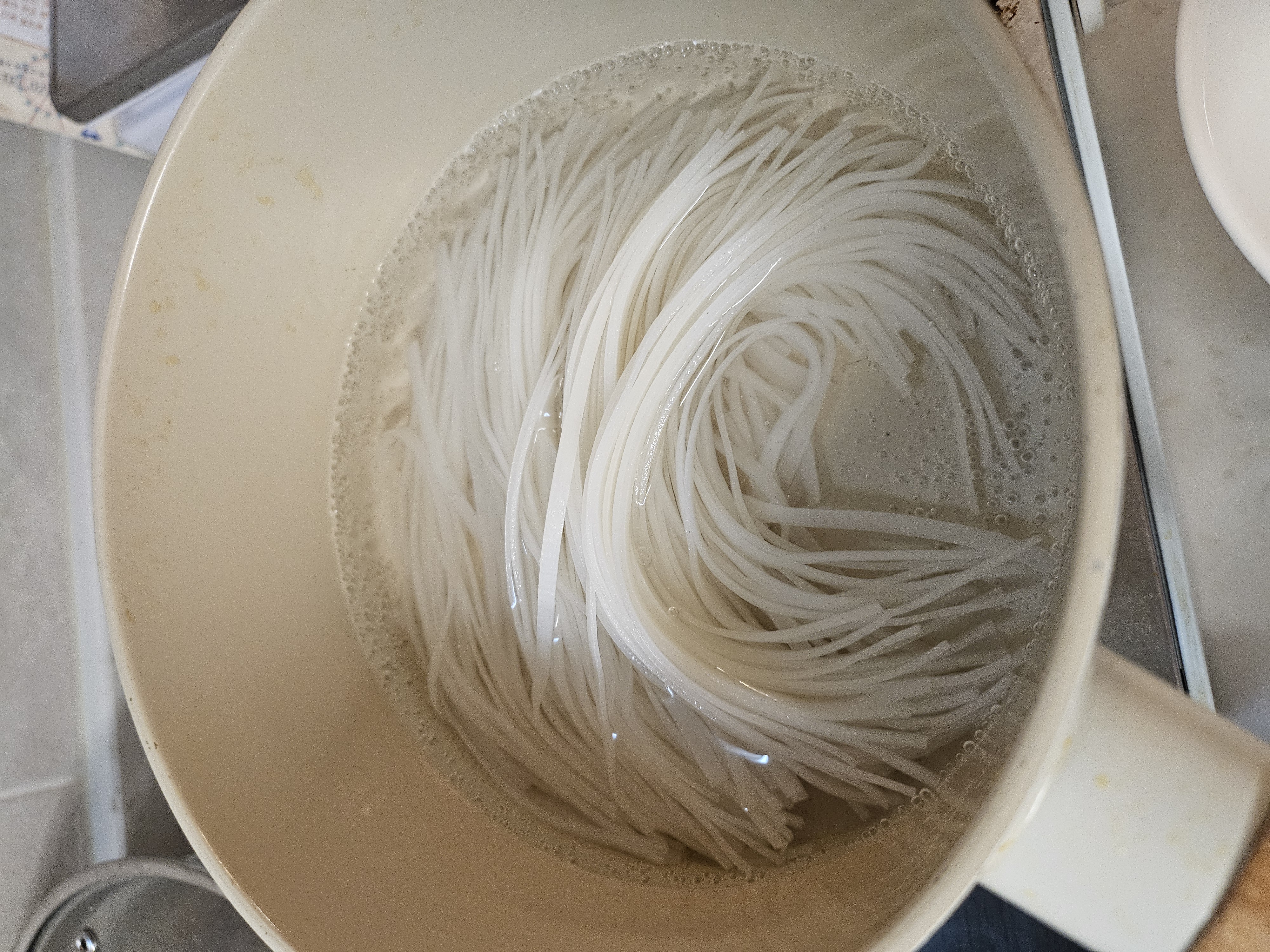 1. 라이스누들 쌀국수용 3mm를 미지근한 물에 30분간 불린다.