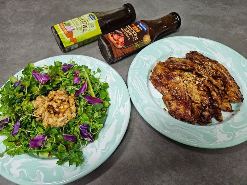 집에 잠자고 있던 샐러드와 낫또를 접시에 세팅하고 폰타나 오리엔탈 드레싱 뿌리면 영양 식단.