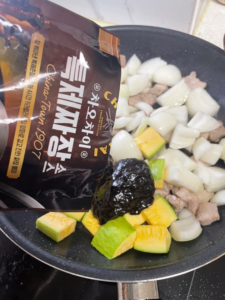 처음으로 애호박을 넣고 만들어 본 간짜장스타일의 짜장입니다.