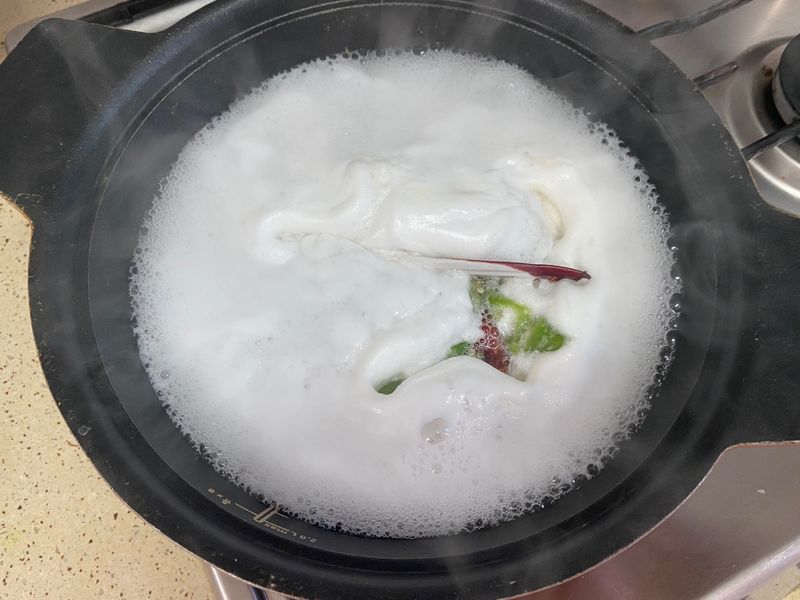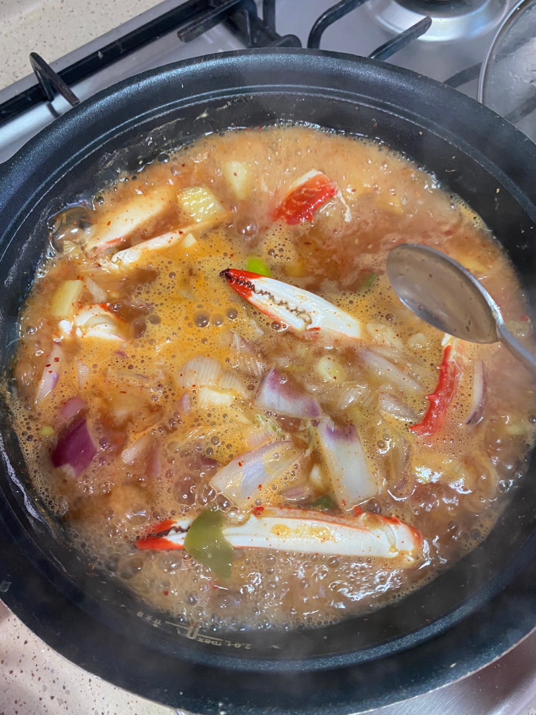 꽃게를 넣고 육수도 넣어 끓이다가