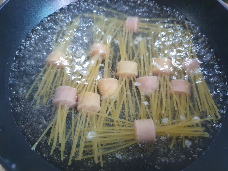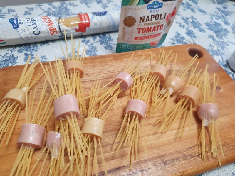 스파게티면을 반 잘라 비엔나소시지에 꽂아주고
