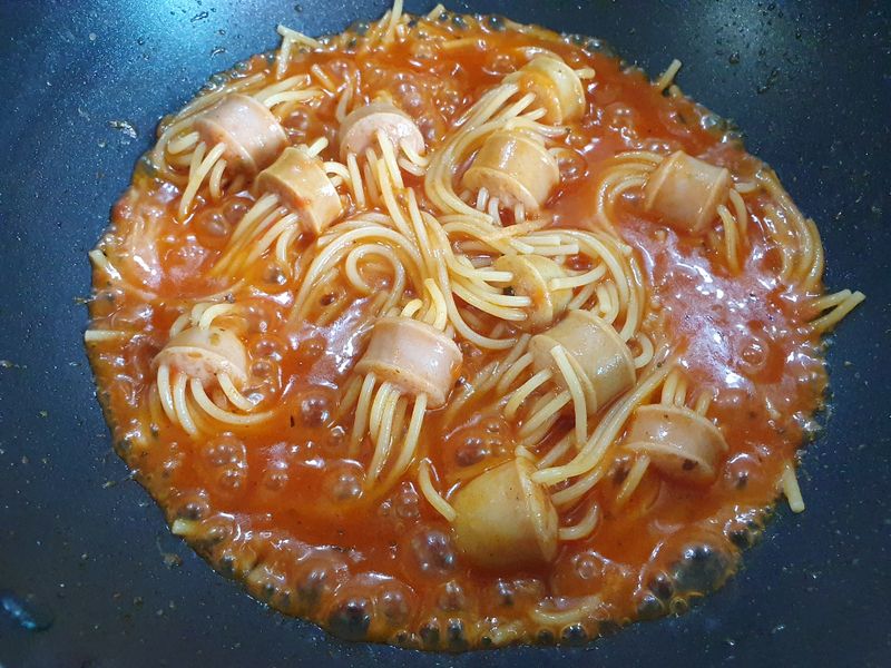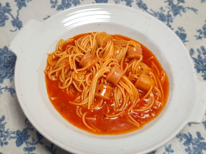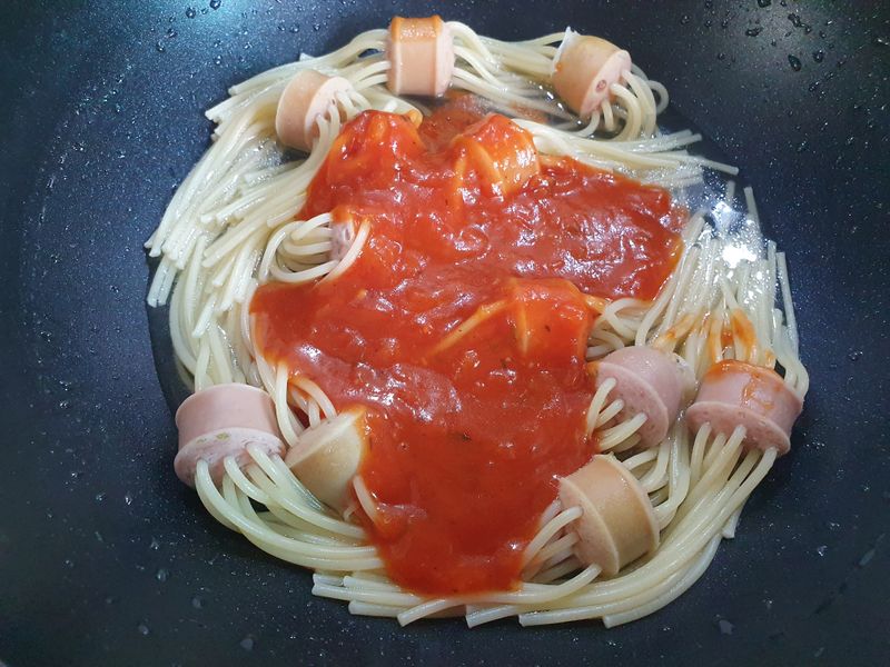 스파게티면과 비엔나소시지, 나폴리 뽀모도로 토마토 파스타소스만 있으면 끝.