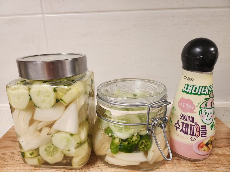 간단 오이피클 만들기 오이, 무 소독한 유리병에 적당한 사이즈로 썰어놓은 무와 오이를 채우고 새미네피클소스를 채워넣고 하루 숙성후 냉장고에 넣어둔후 시원하게 하여 먹는다