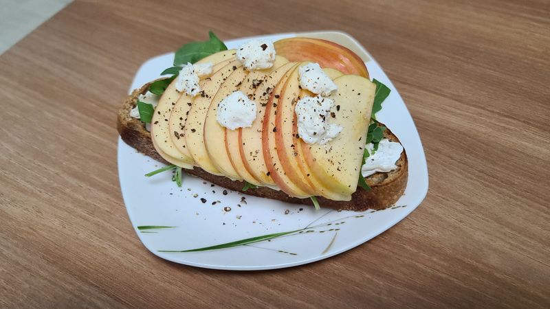 사과 브리치즈 샌드위치 만들었어요! 사워도우 빵 토스팅 후 홀그레인 머스타드도 바르고 브리치즈랑 루꼴라, 사과 올려서 완성했어요 짭쪼름한 치즈랑 달콤한 사과 조합이 좋아요~~💓