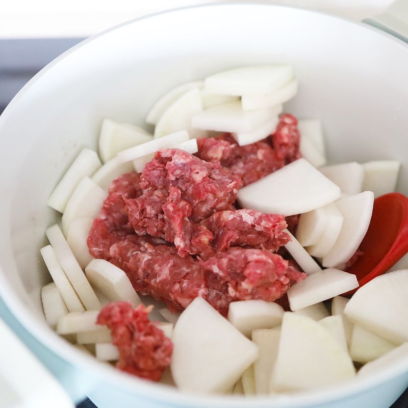 2. 예열한 냄비에 포도씨유를 두른 다음 소고기와 무를 넣고 볶아주세요