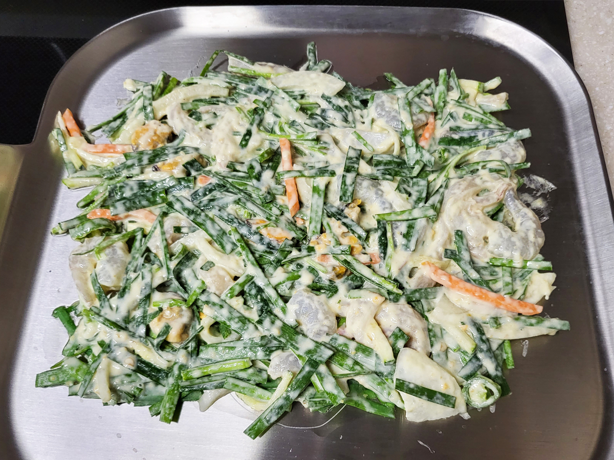 손질한 해물과 야채에 부침가루와 물을 넣고 잘 반죽한 다음 기름을 넉넉하게 두른 팬에 올렸어요.
