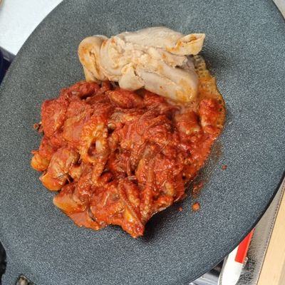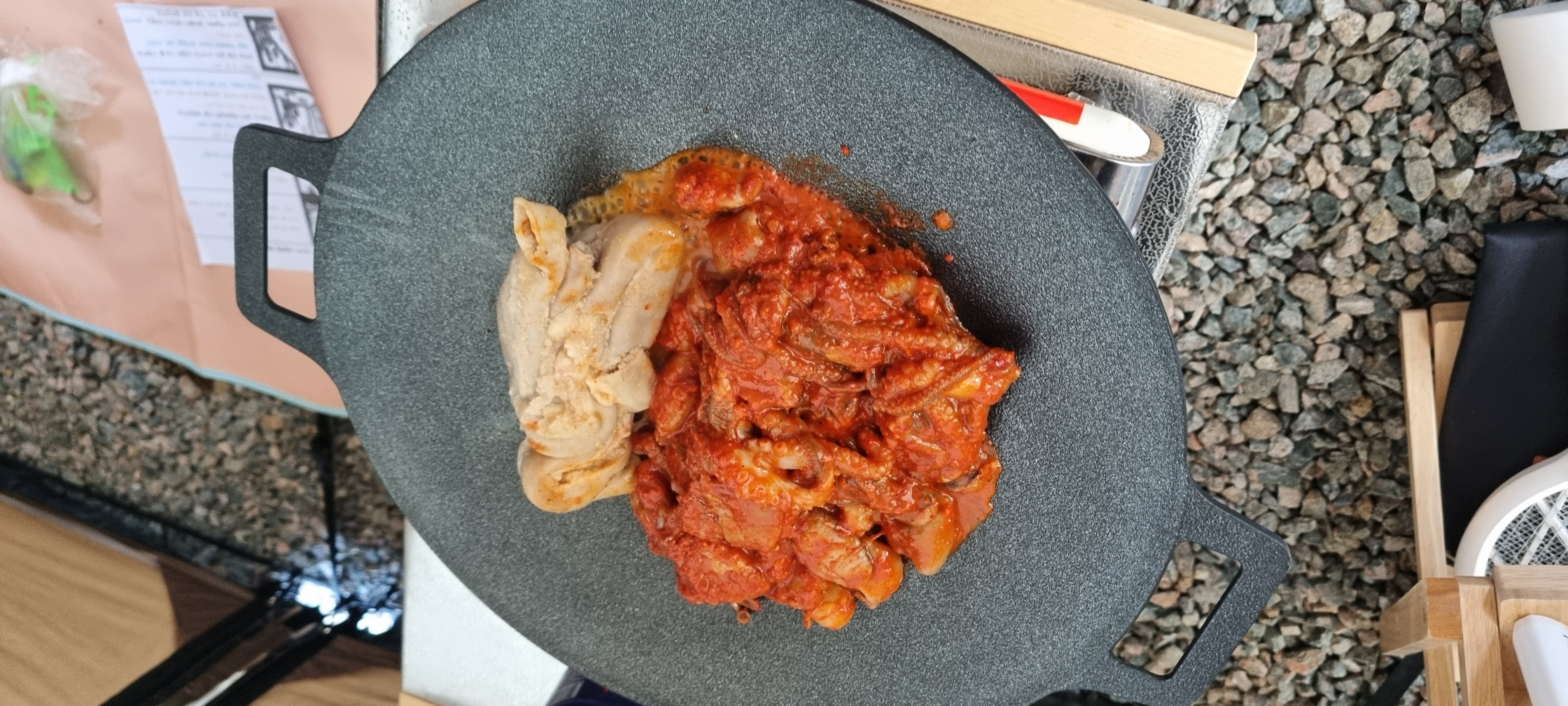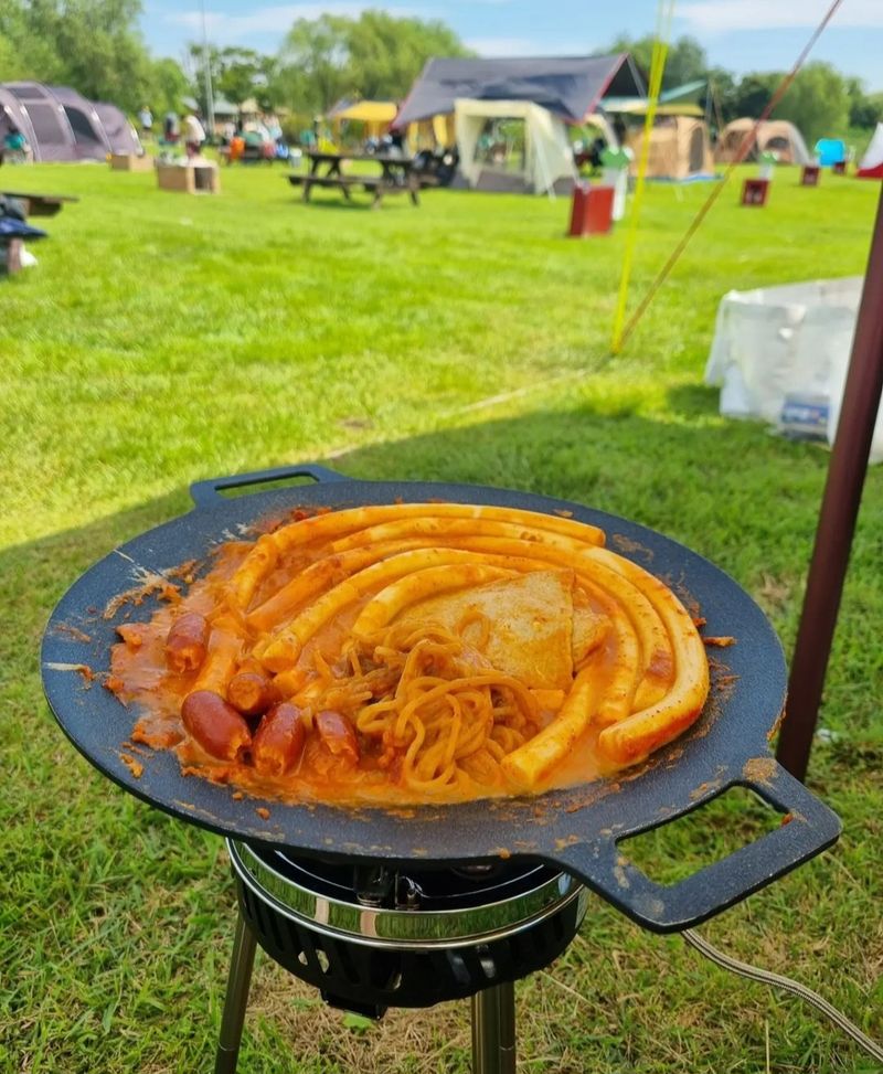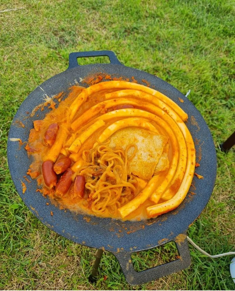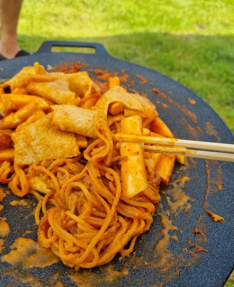 캠핑 느낌 팍팍 나게 그리들 꺼내서 분명 조리법대로 떡볶이를 만들었는데 비쥬얼 무엇.. 옆에서 남편은 가래떡볶이가 가래떡+볶이가 아니라 가래+떡볶이냐며.. 하악