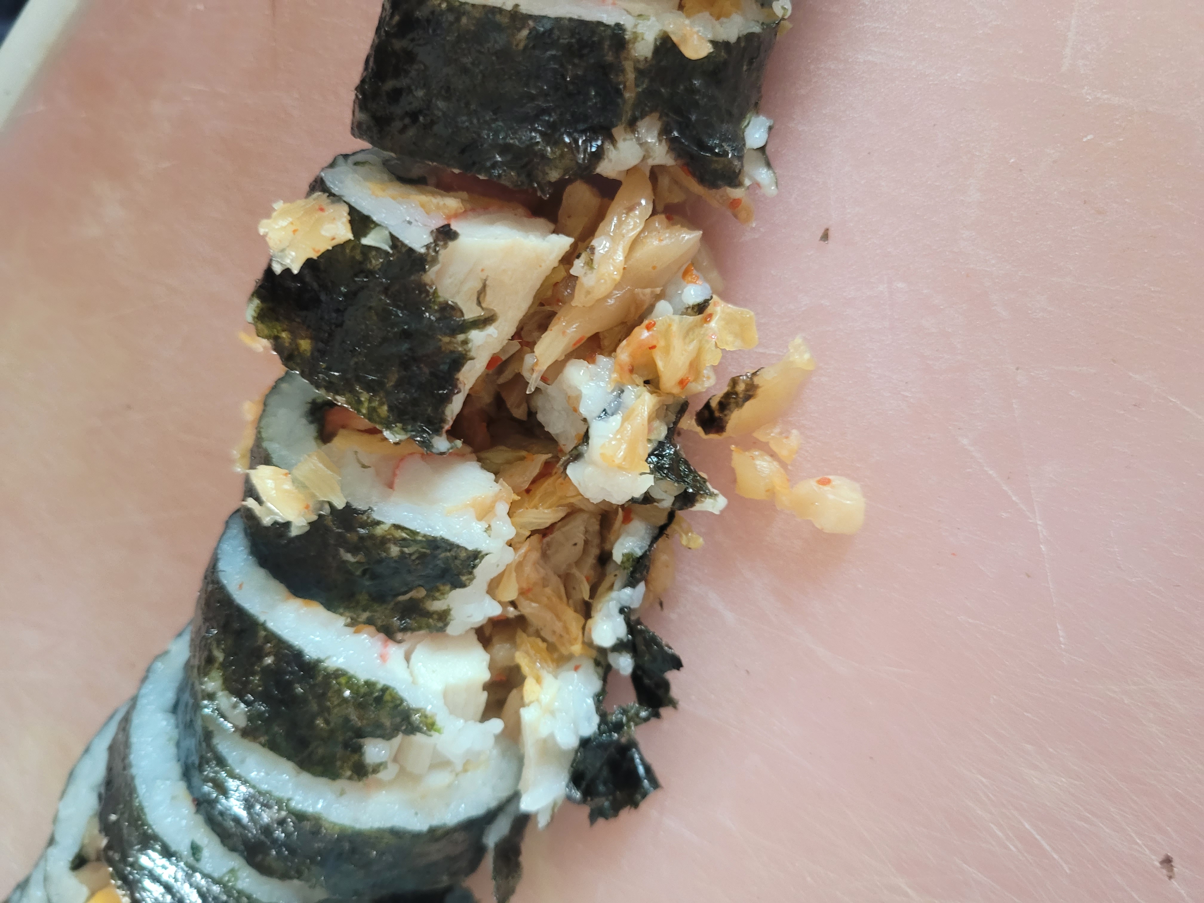 밥에 식초, 설탕, 소금 밑간하고 묵은지도 국물을 쭉 짜내고 송송송 썰어서 넣었고 햄과 계란, 맛살, 우엉, 단무지 까지 야무지게 준비해서 넣었는데..