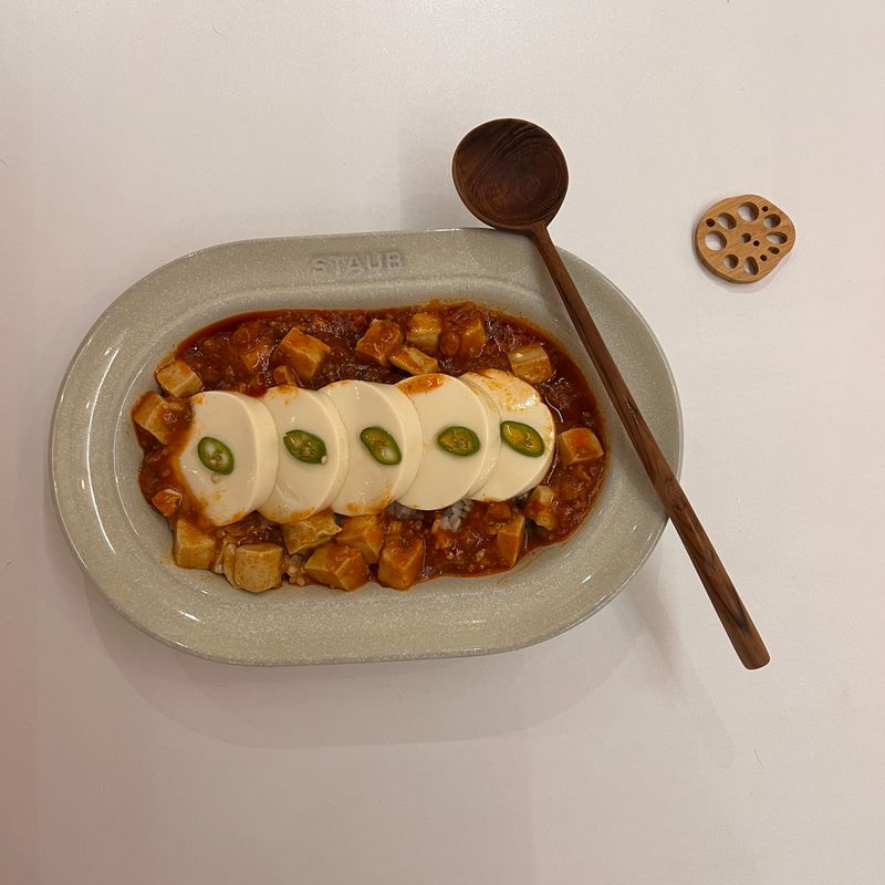 차오차이 마파두부 소스로 간단하지만 맛있는 한 끼! 밥을 그릇에 담고, 순두부도 살짝 데워준 후에 소스 가득 붓기만 하면 끝이에요
