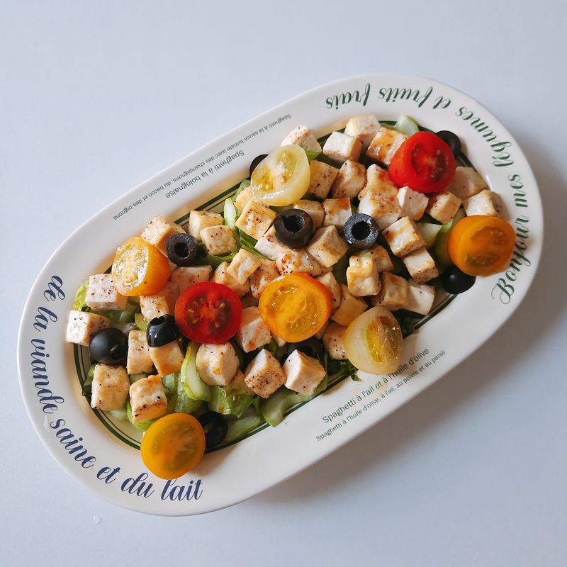 5. 채소와 오이를 밑에 깔고 구워준 두부와 방울토마토 올리브 올려 오리엔탈 드레싱 뿌려 마무리해준다.