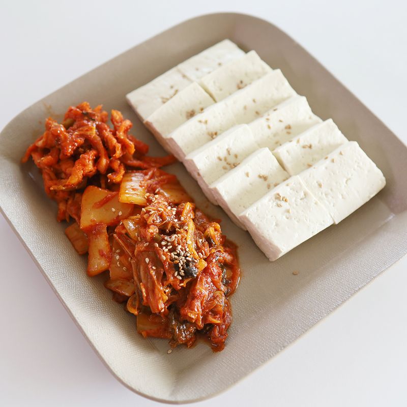 두부를 먹기 좋은 크기로 자른 다음 김치와 함께 접시에 담으면 두부김치 완성입니다!
