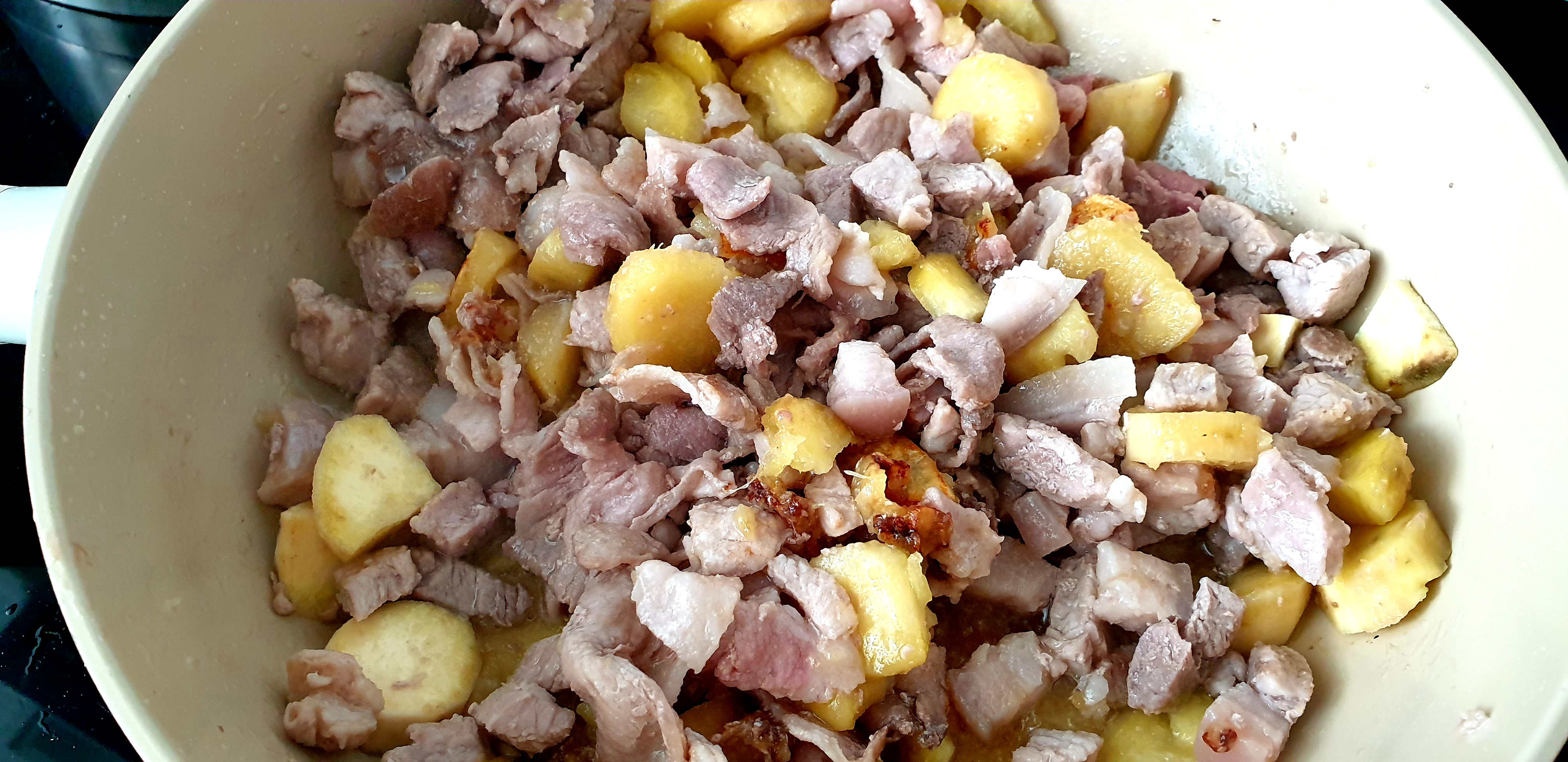 3. 후라이팬에 돼지고기를 볶다가 달콤한 고구마도 깎둑썰기해서 같이 볶아 줍니다.
