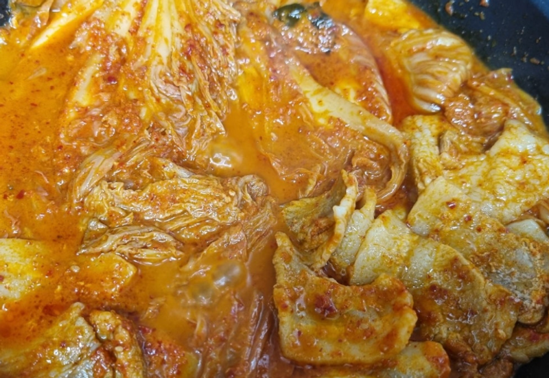 김치찌개보다는 국물을 조금 넣어서 자작하게 만들어서 먹는 김치찜