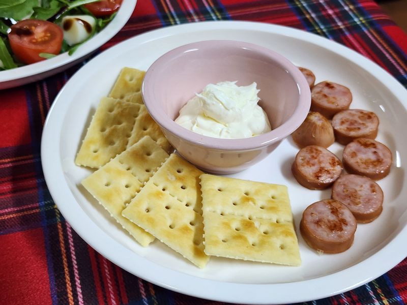 담백한 크래커와 카이막치즈 또는 크림치즈 냉장고에 뒹굴던 소세지 구워 담아내면 끝.
