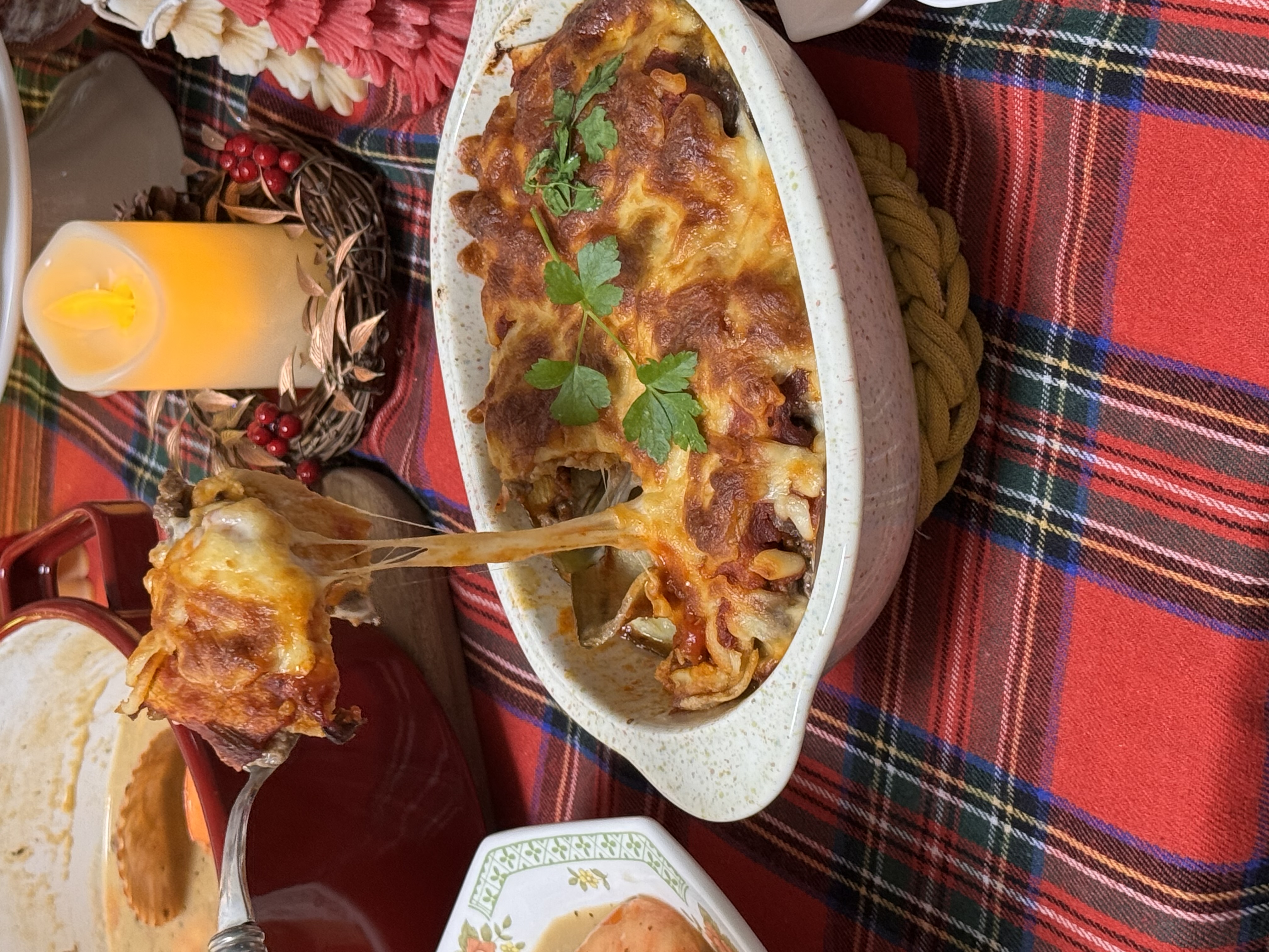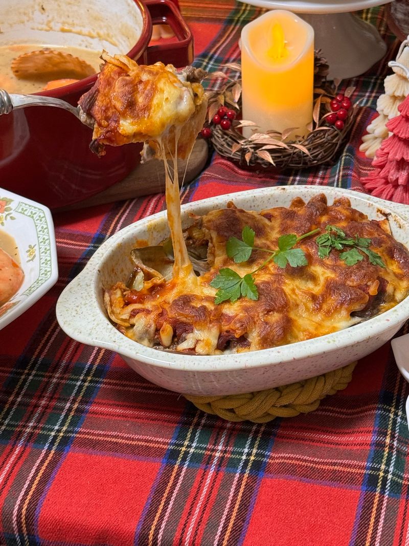 다음은 토마토소스, 가지, 또띠아, 볶은 다짐육, 모짜렐라치즈를 3번 쌓아서 오븐에 구워낸 라자냐에요.