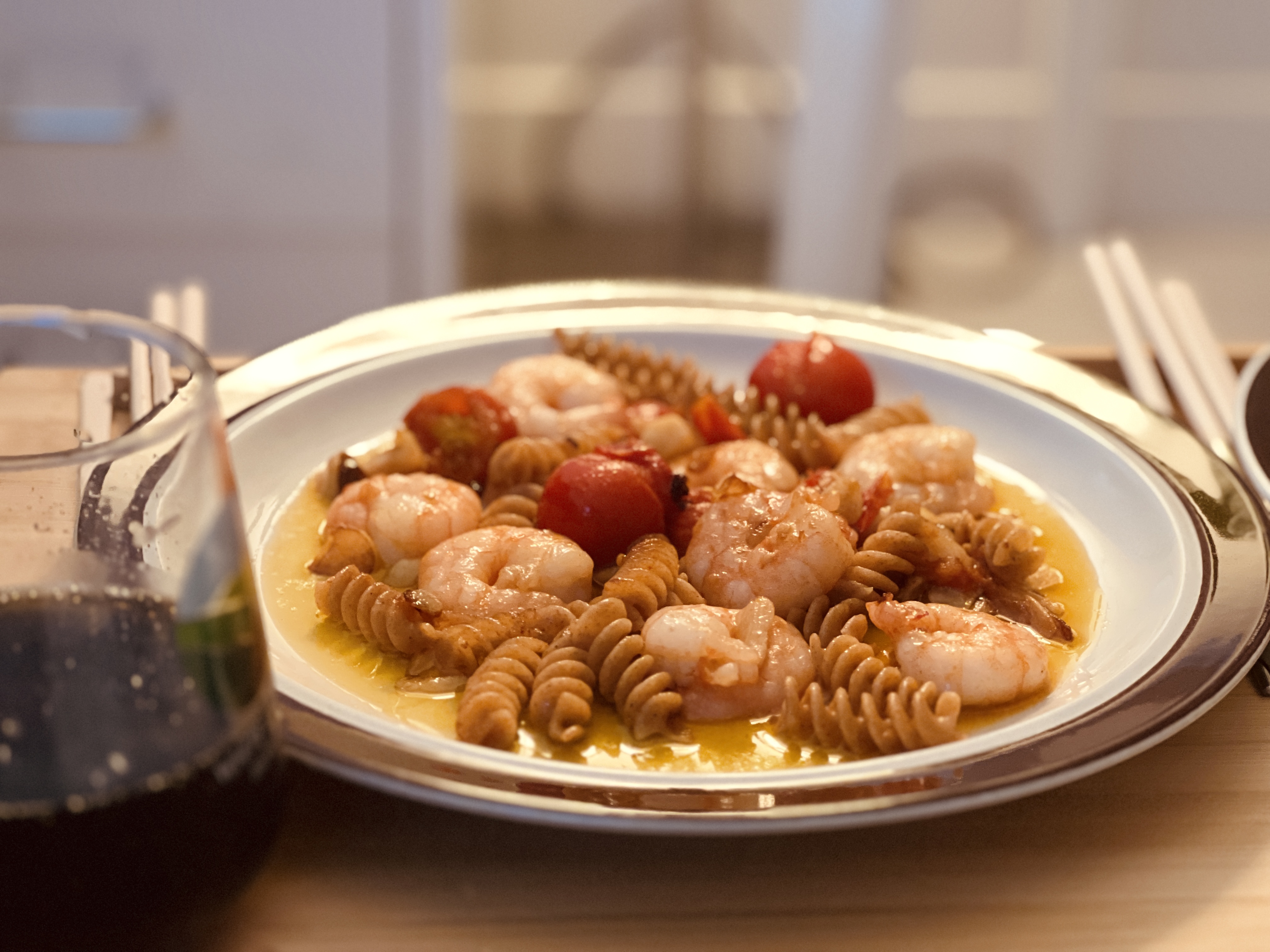 새우 감바스에 토마토, 푸실리 파스타면을 넣은 메뉴 하나랑!