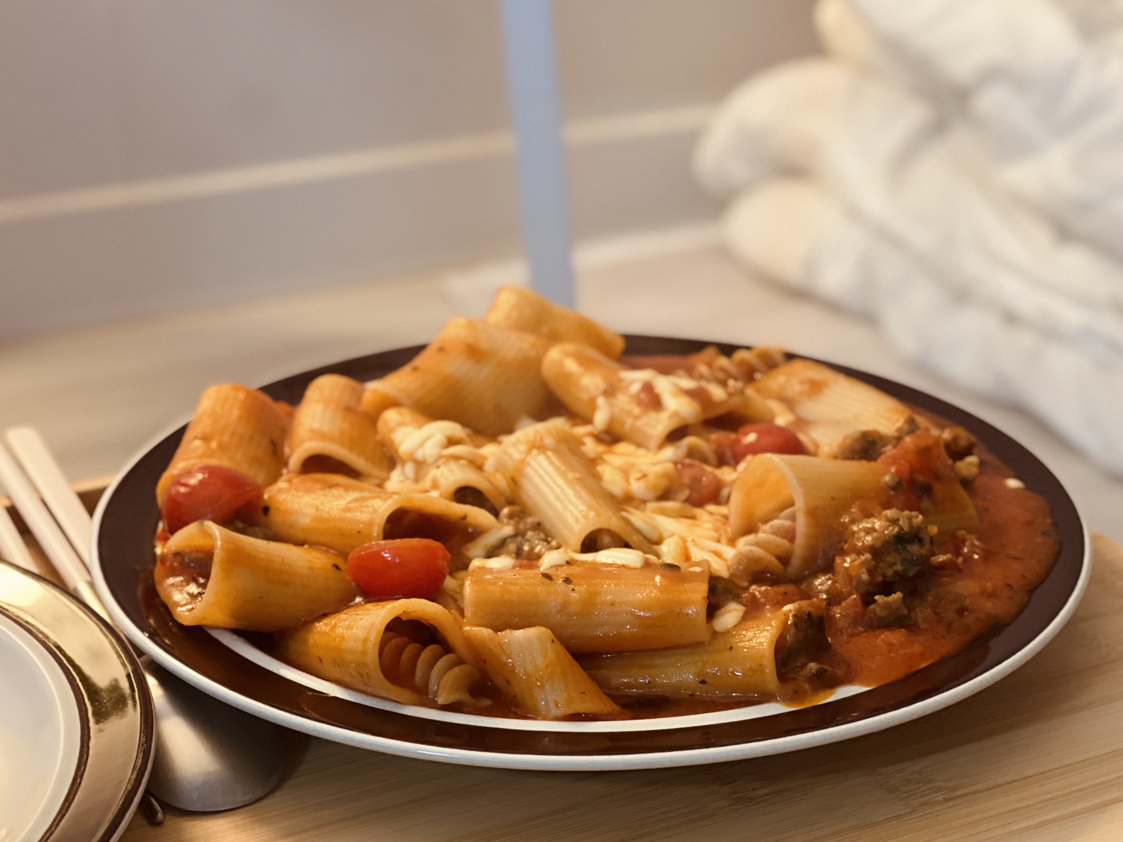 쨋든 리가티면, 푸실리를 같이 토마토소스에 볶고 양념한 고기 민찌도 넣어서 풍미를 더해줬어요!