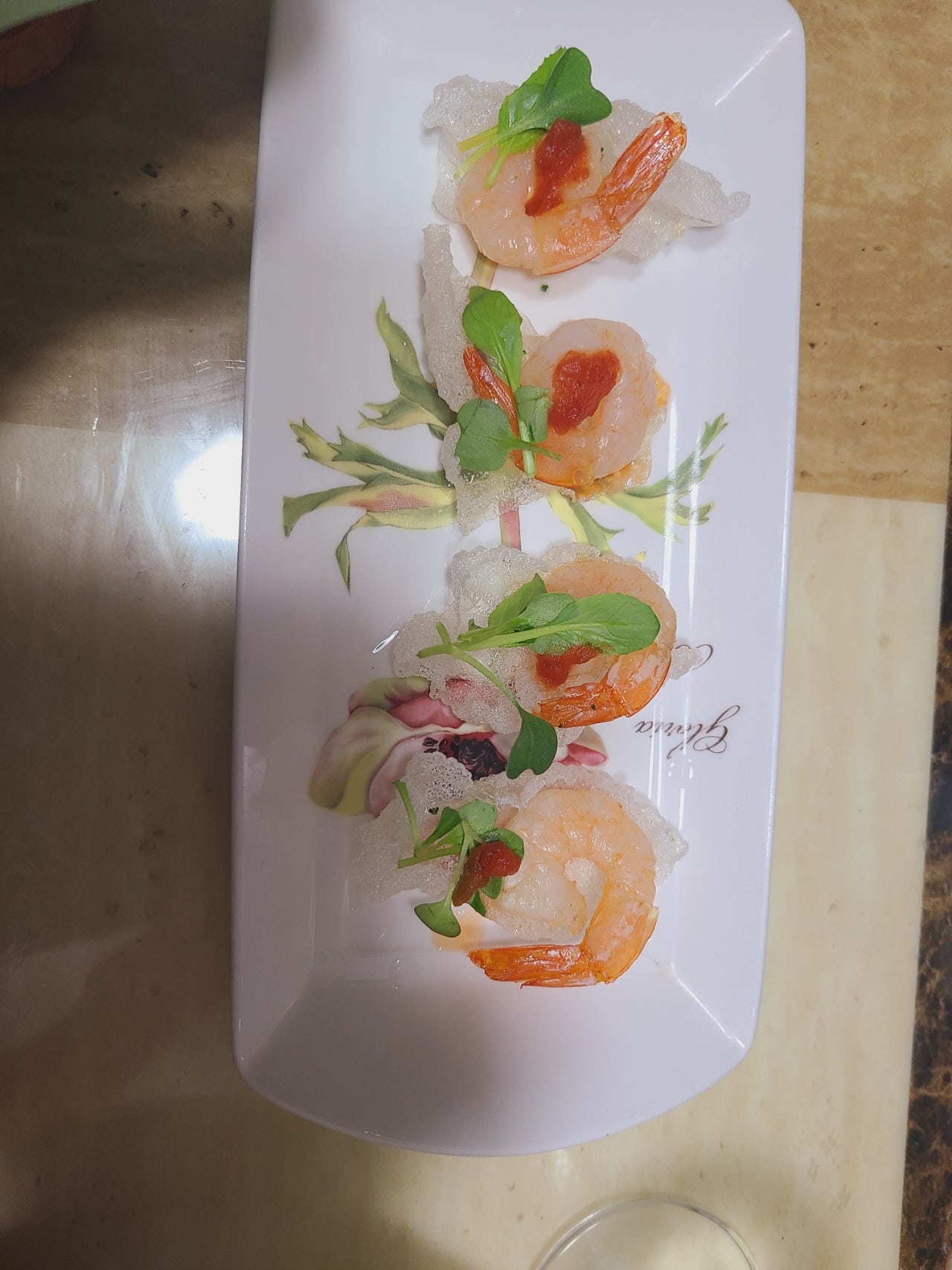 그위에 새우랑 어린잎채소랑 살사소스로~~