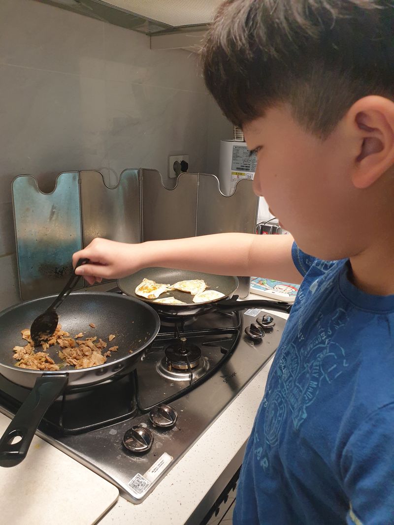 어제 맛있게 먹은 불고기 오늘 또 먹으려니 오늘또?라고할까봐 고기 볶음밥 만들었어요 불고기 잘게 잘라 볶고 굴소스 넣고 밥넣고 볶아주면 오케이 아이와 같이 잘 만들었어요