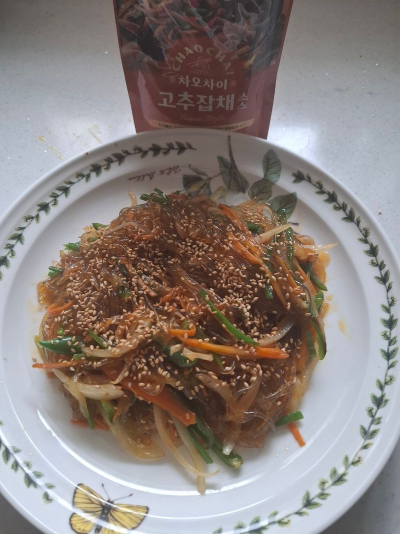 냉장고 야채 재료 파프리카 .양파.오뎅 썰어주고 당면을 삶아 살짝 찬물에 한번 헹거준다... 그리고 고추 잡채 소슬 넣고 버물러 주면 끝~~~~~ 소스의 불맛이 .... 매일 먹어도 질리지 않아요