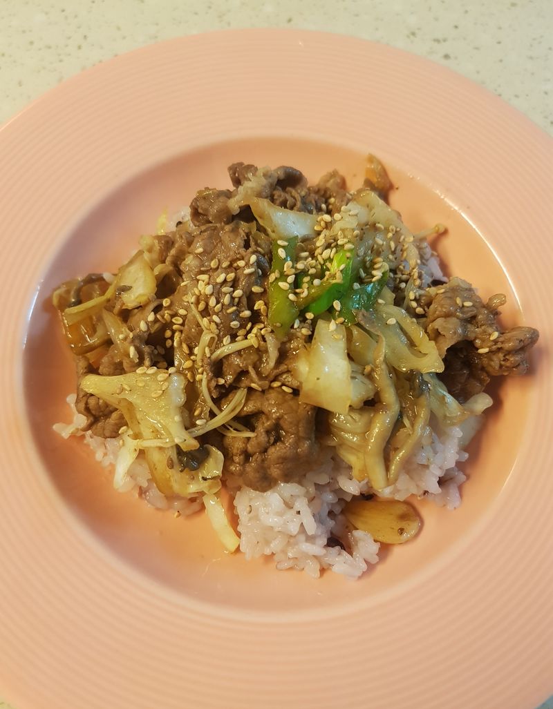 대패삼겹이나 차돌박이랑 양배추 굴소스에 볶아 덮밥.