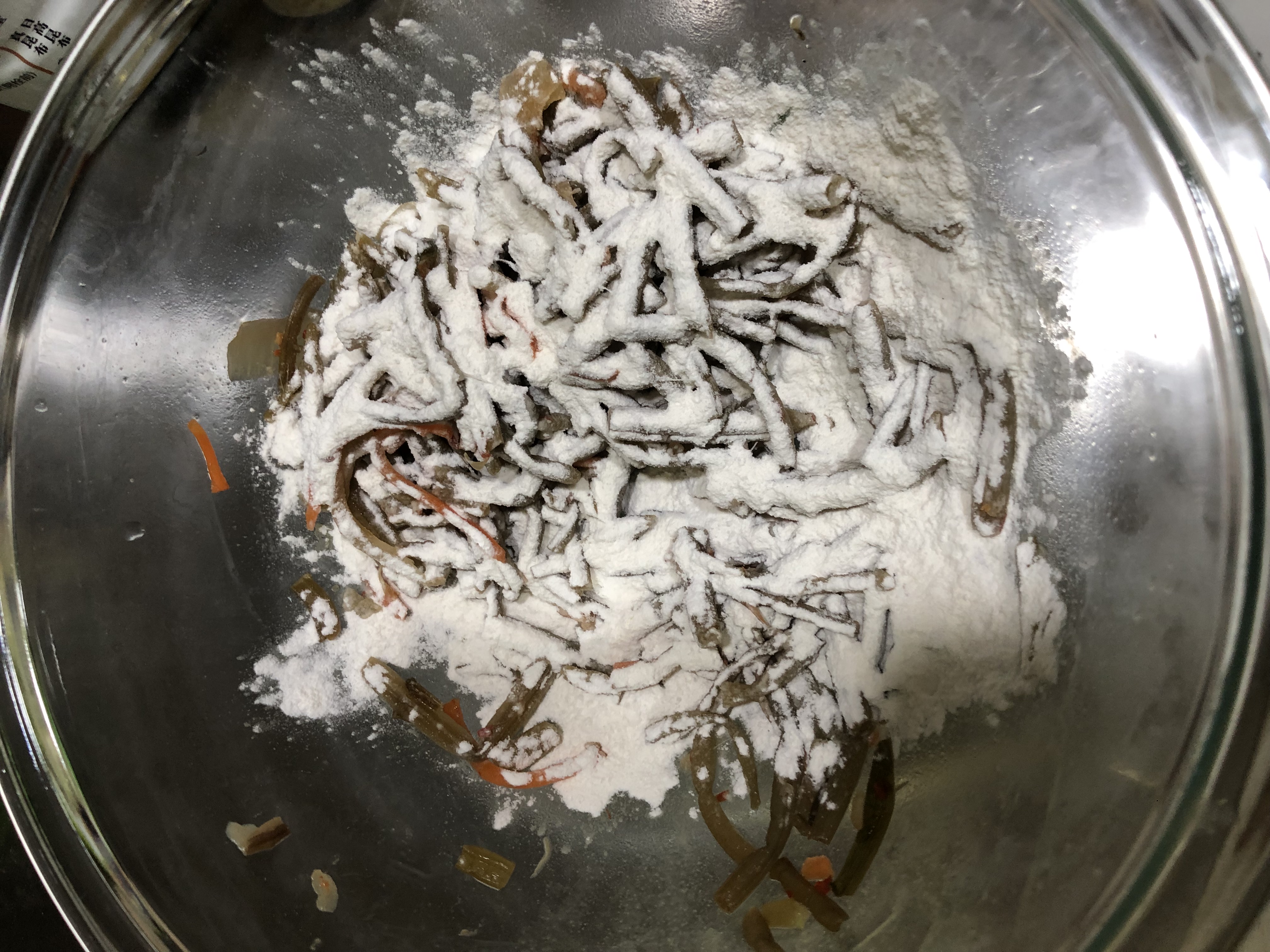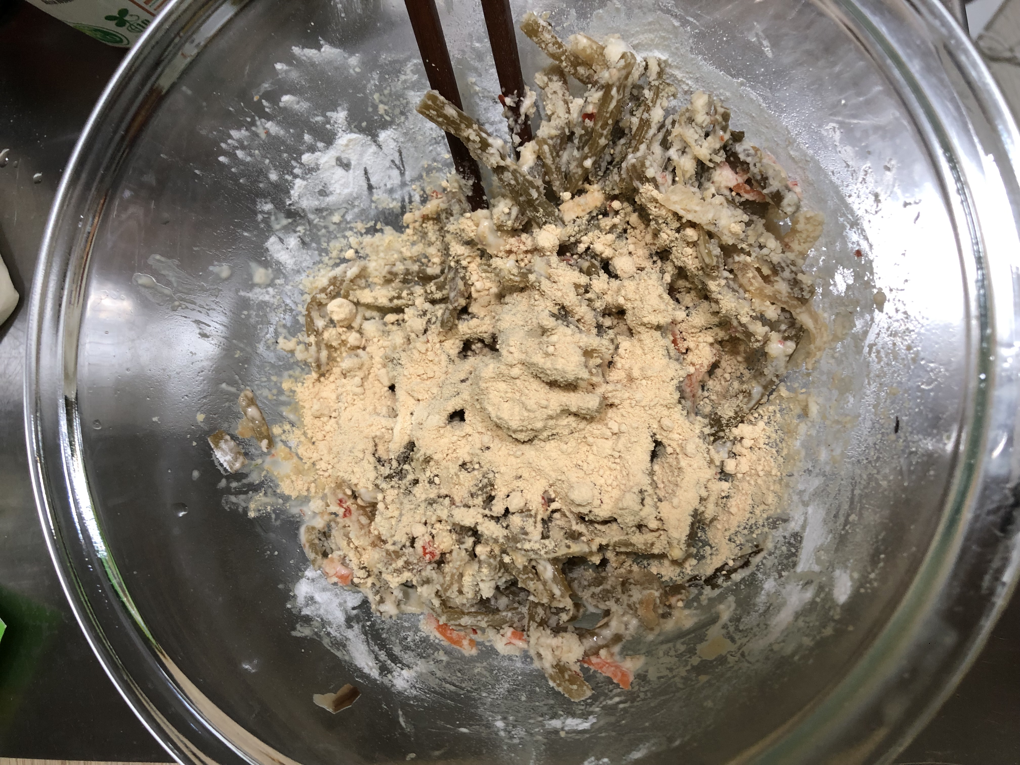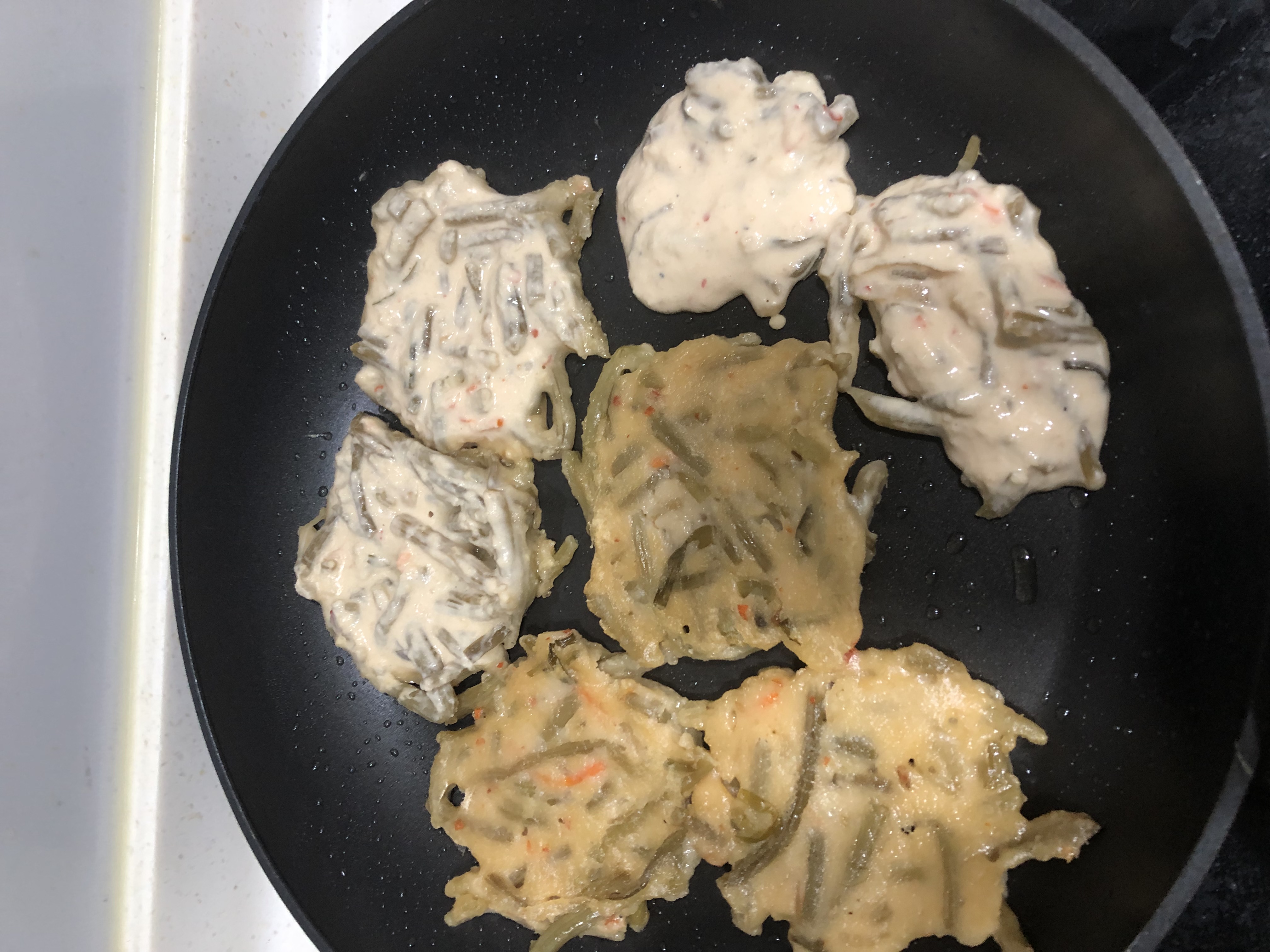 튀김가루 넣고 고소하라고 콩가루도 넣고 한 번 지져 봤어요. 고소하고 살짝 아삭하고 맛있네요.