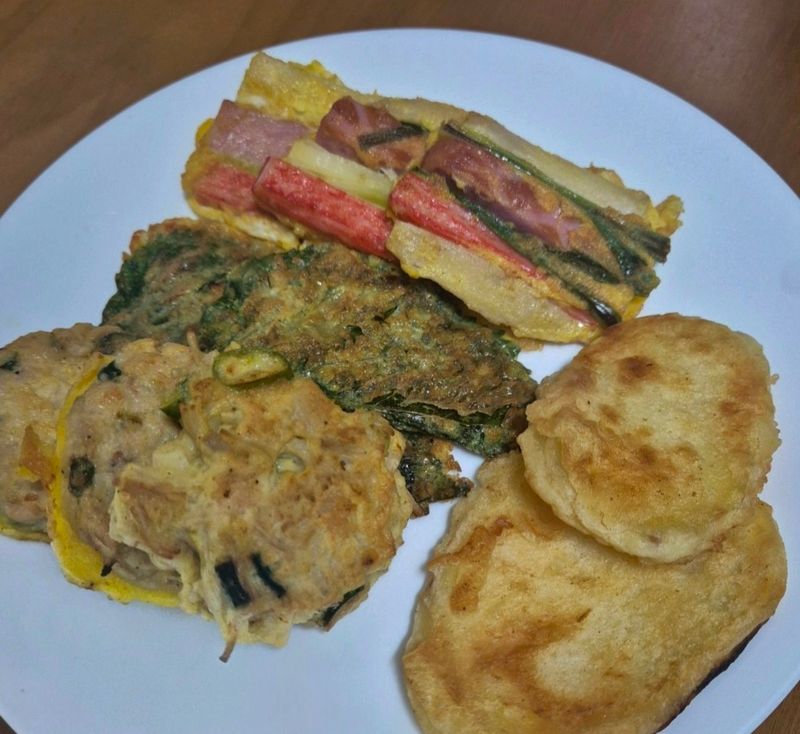 설 연휴때 가족들과 함께 만든 모둠전입니다! 꼬치전, 깻잎전, 고구마전, 새우전 등등 있어요!