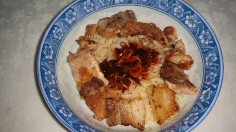 1. 쫄면 양념장을 만든다. 고추장 2스푼 > 올리브유 1스푼 > 식초 1스푼 2. 프라이팬에 식용유를 두른 후 삼겹살을 노릇노릇 굽는다. 3. 사리면을 끓는 물에 삶는다. 4. 접시에 사리면과 쫄면 양념장을 넣고 프라이팬을 원형 모양으로 덮는다.