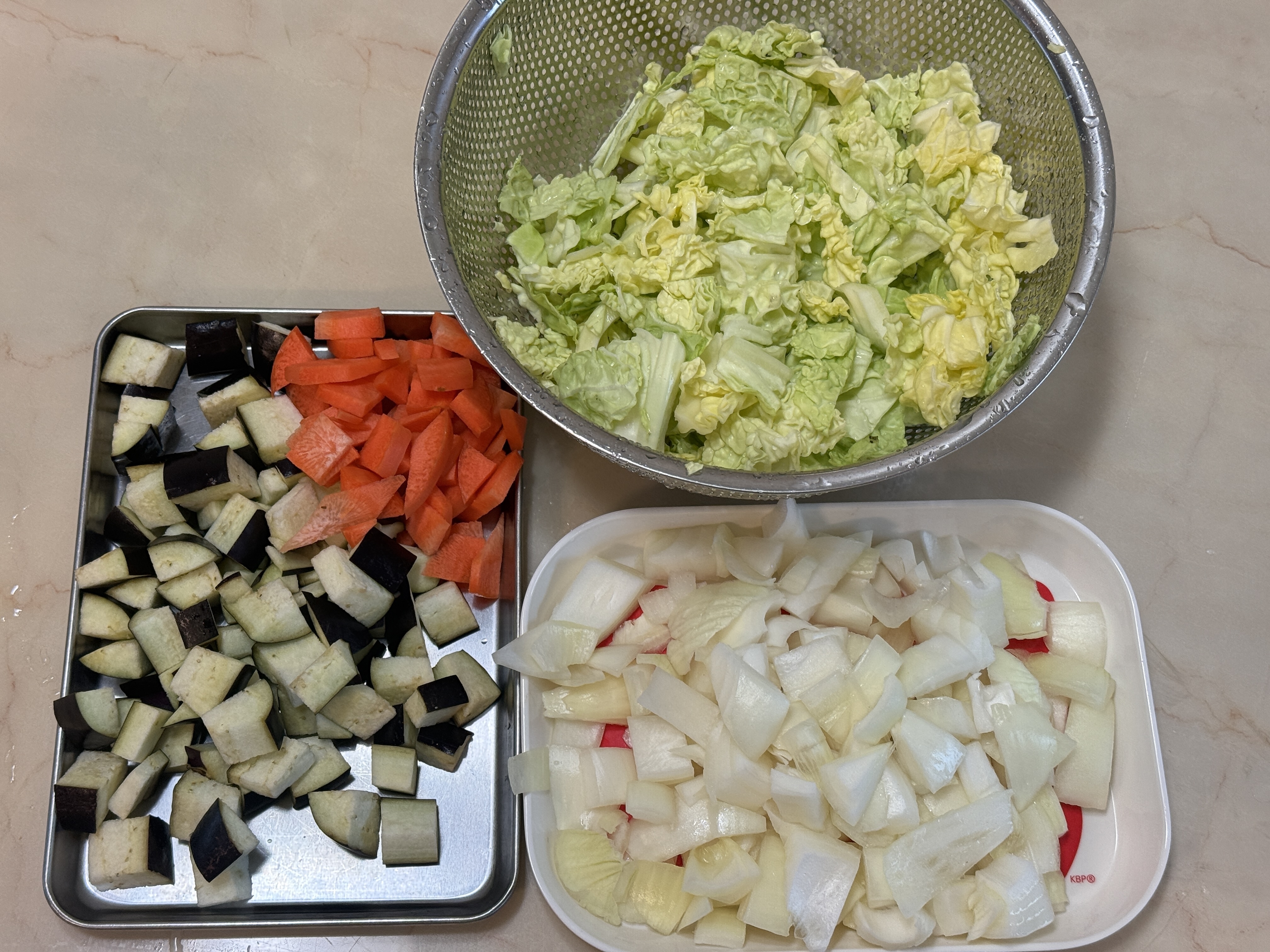 🔹 다루기 까다로운 가지와 양배추도 새미네 요리해요에서 알려준대로 칼질하니 더이상 겁나지 않아요! 신이나서 양파와 당근도 다 같이 깍둑썰기로 도전해서 시도했답니다! 🙂