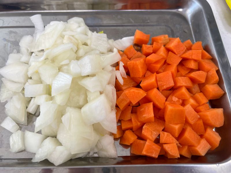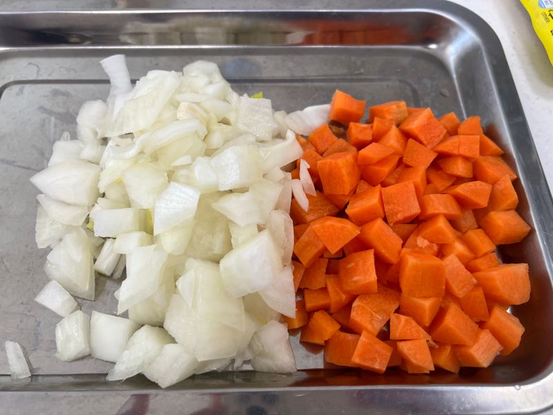 카레에 넣을 당근과 양파는 깍둑썰기로,