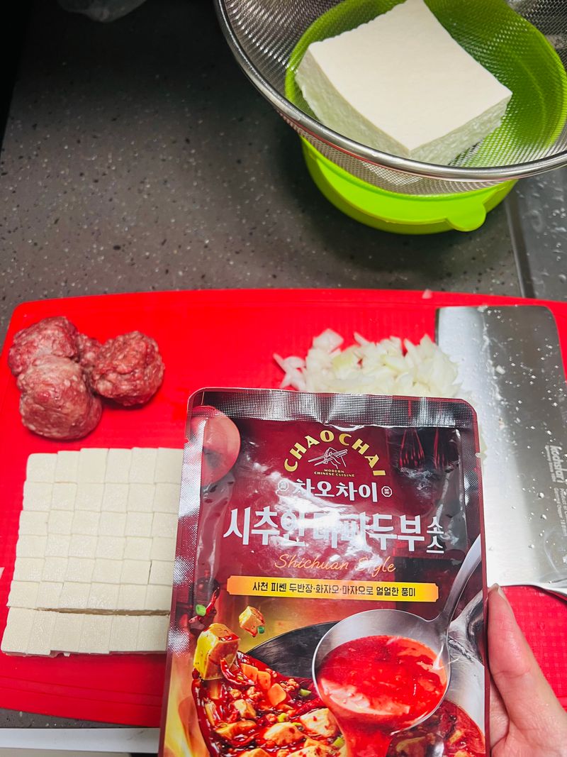 먼저 두부 두모를 사왔습니다. 두부에 물기를 빼기 위에 채반에 두었다가 마파두부를 만들기 위해 깍둑 썰기를 해줬어요. 요린이인 저도 뚝딱뚝딱 했답니다. 작은 양파 한개를 같은 크기로 잘라주었구요. 예전에 소분해둔 간소고기도 넣기로 했습니다. 두부, 간소고기, 양파반개, 차오차이 마파두부소스로 준비물은 끝!!