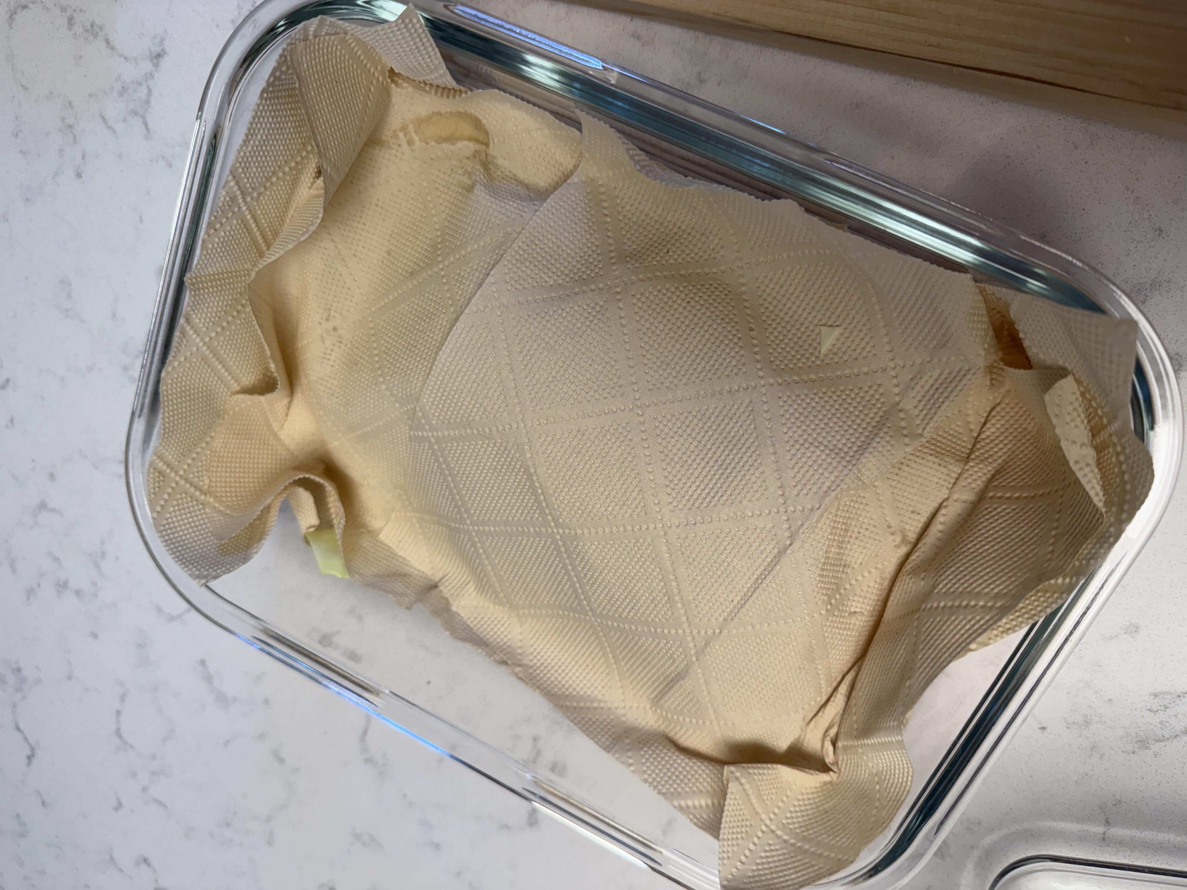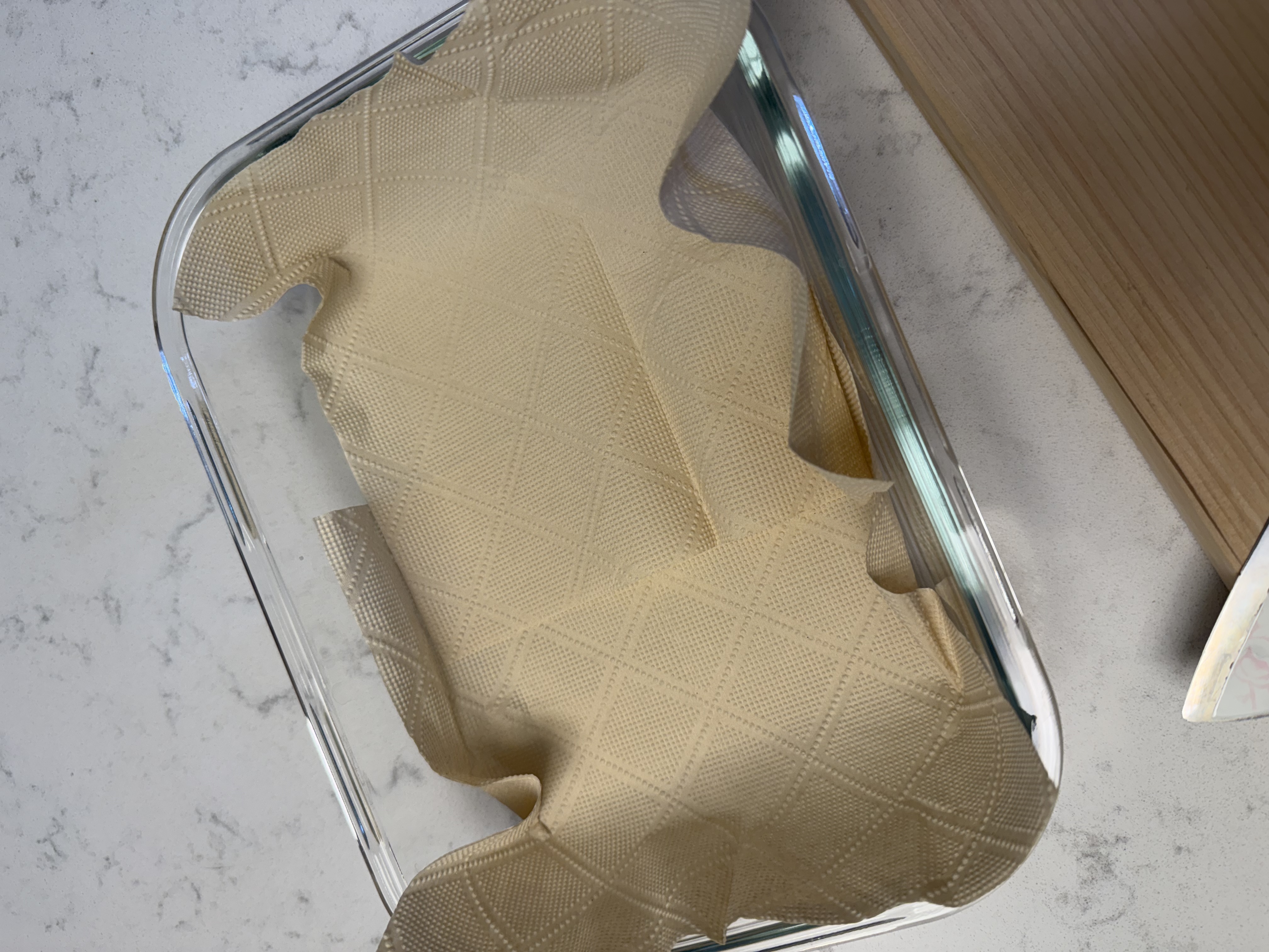 통 안에 예쁘게(?) 쌓아주고 다시 키친타올로 덮었습니다.