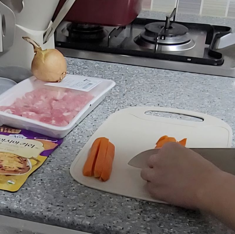 저는 당근과 양파를 손질해 보았는데요! 카레를 만들기 위해서도 있고, 가이드에 가장 쉽게 나와 있는 게 두 가지라서 진행해 보았어요. 요리 경험이 전무해서 쉽지 않은 시간이었어요. 하지만 가이드가 친절하게 되어 있어 도전해 볼 수 있었습니다.