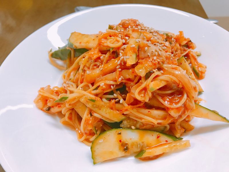 백종원 아저씨의 김치비빔국수 레시피를 참고해서 해먹어봤어용 ㅎ_ㅎ 날이 점점 더워져서 국수류가 무척 당기더라고요 마지막에 참기름만 쓱 둘러주면 어찌저찌 먹을만해지는 마법!!! 즐거운 주말이었어요 :) *** 재료(*2인분 기준) 소면 200g, 배추김치 100g, 오이 양념장 고추장 80g, 설탕 3큰술, 식초 4큰술, 진간장 1큰술, 고춧가루 1/2큰술, 간 마늘 1큰술, 깨소금, 참기름 꼭! (마무리는 꼬숩게~)
