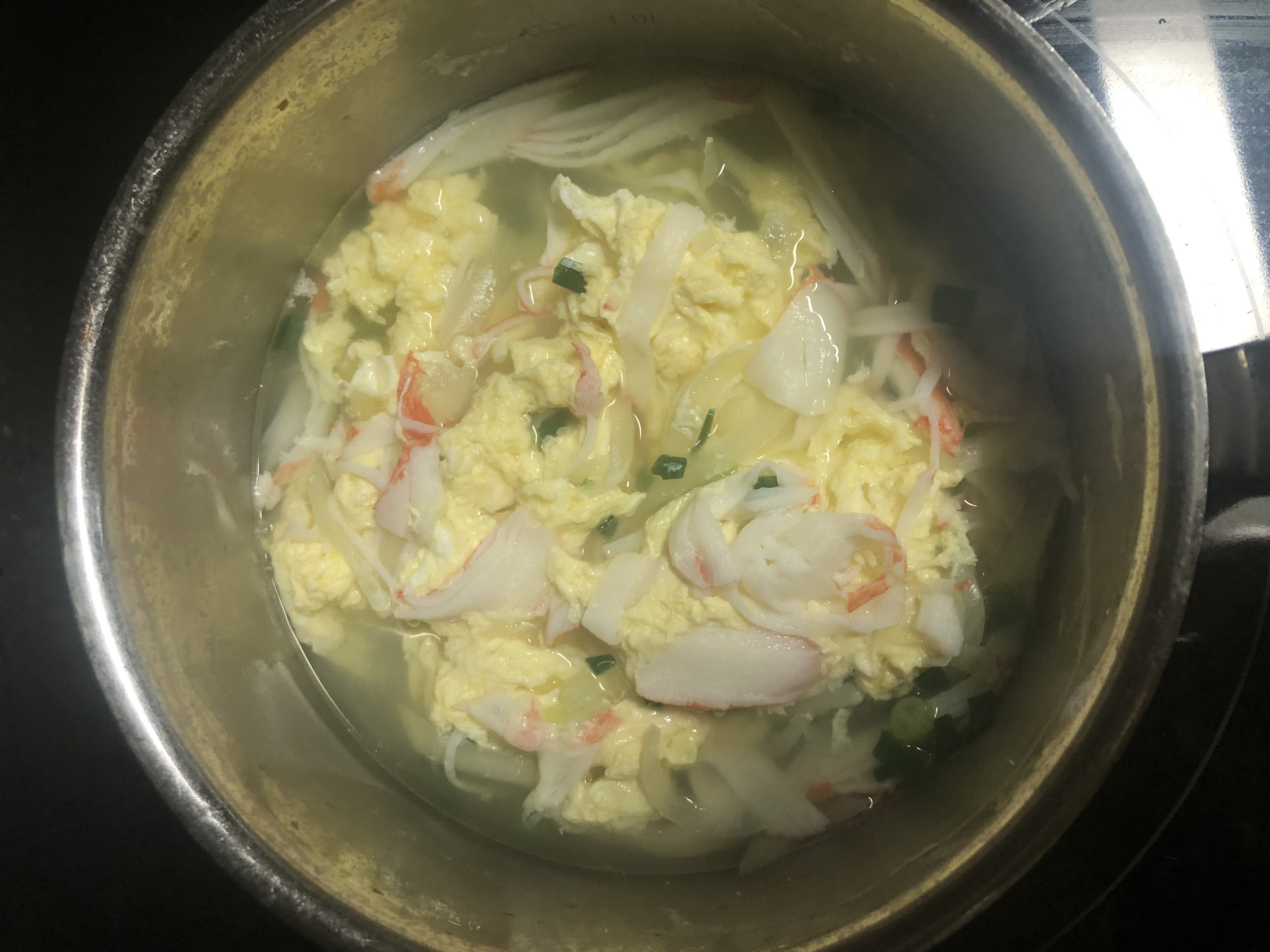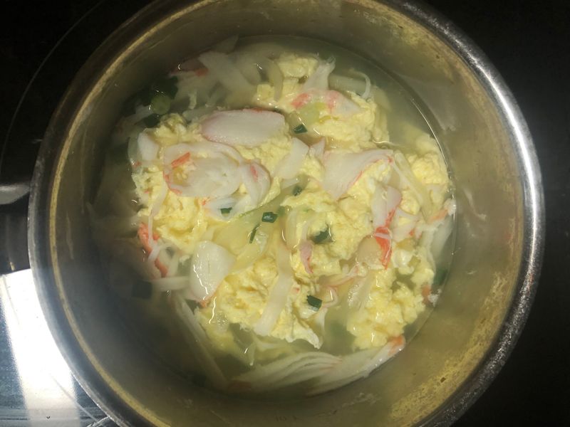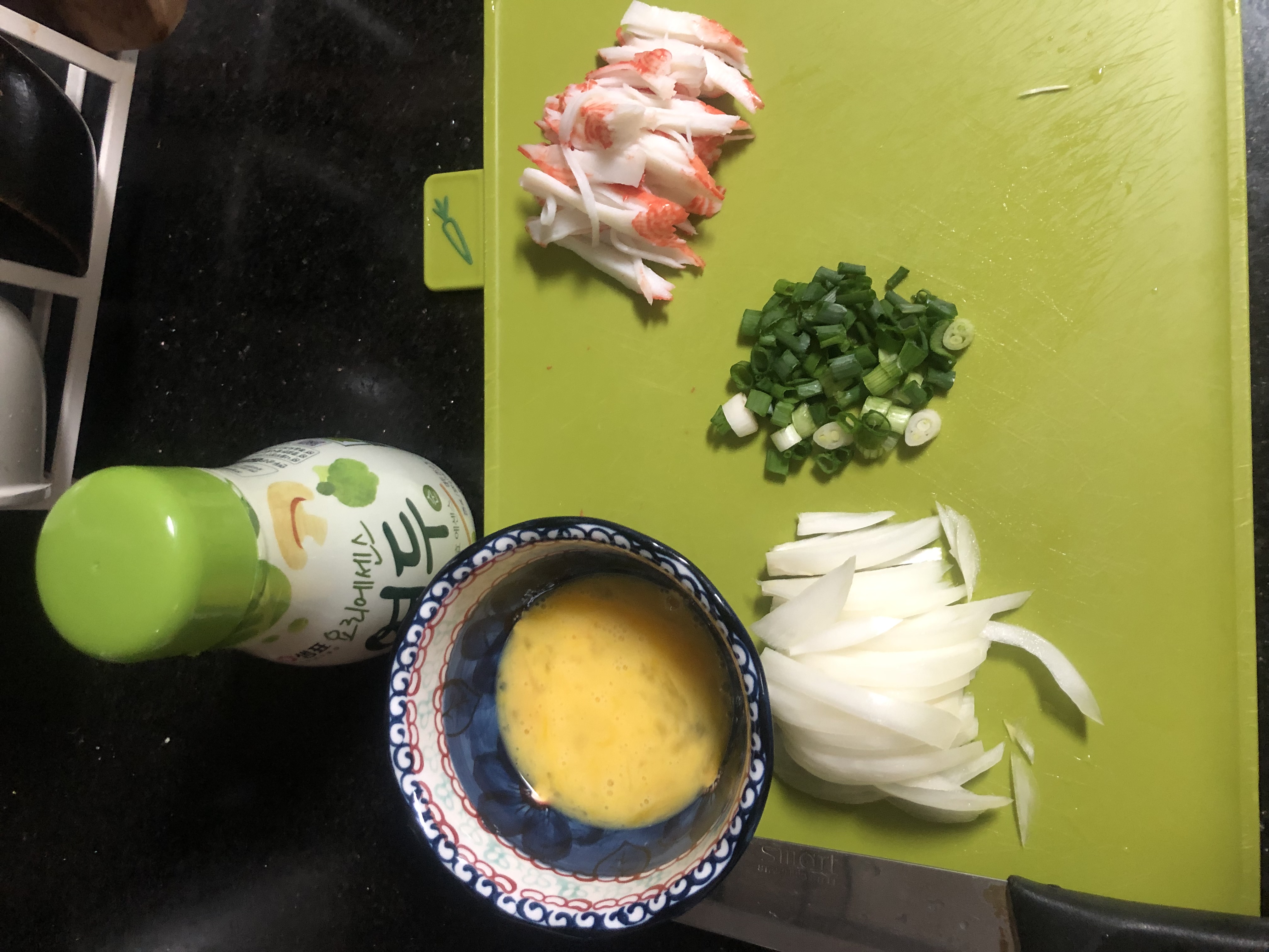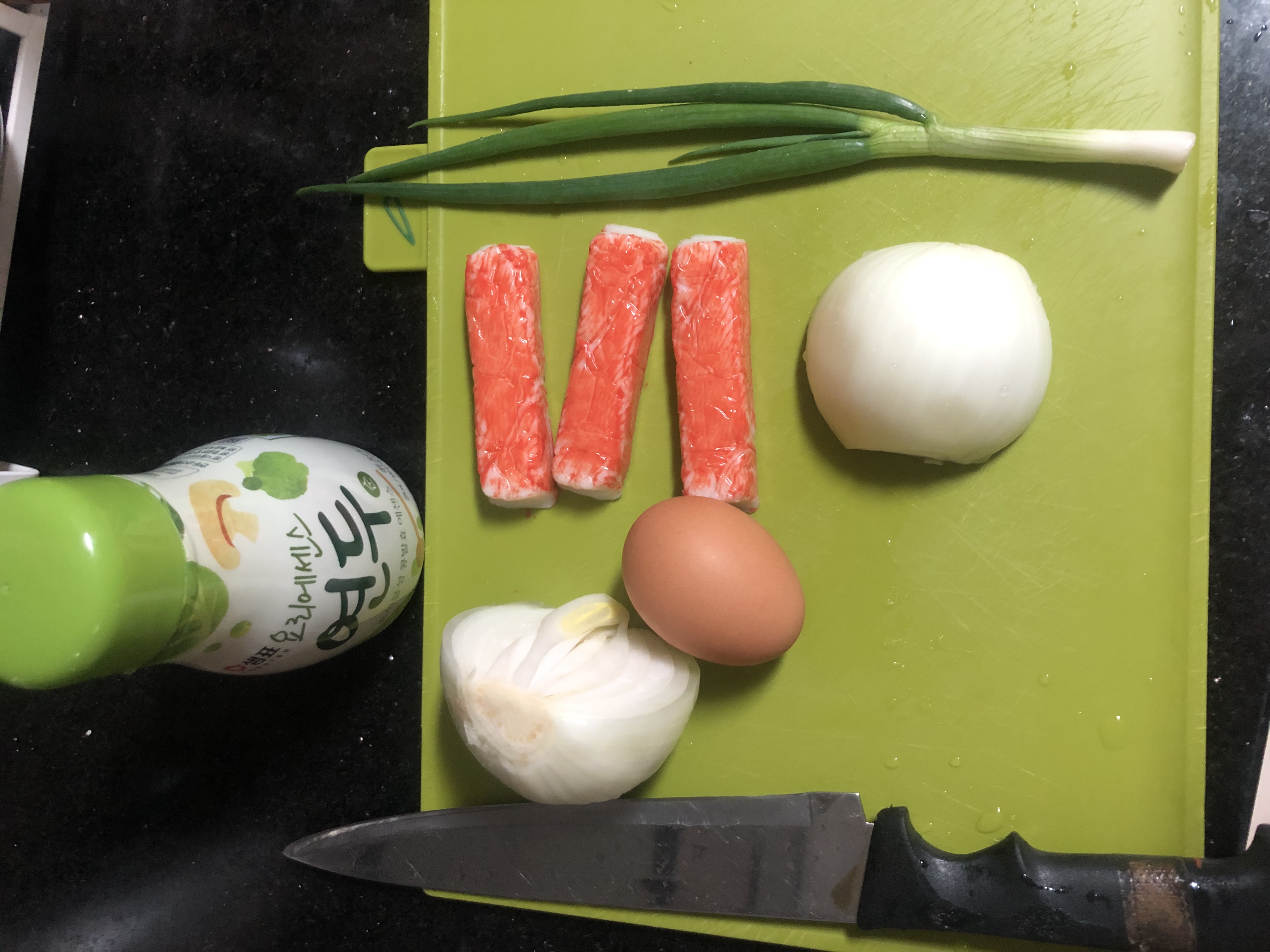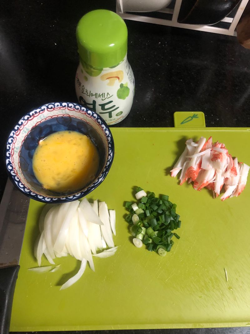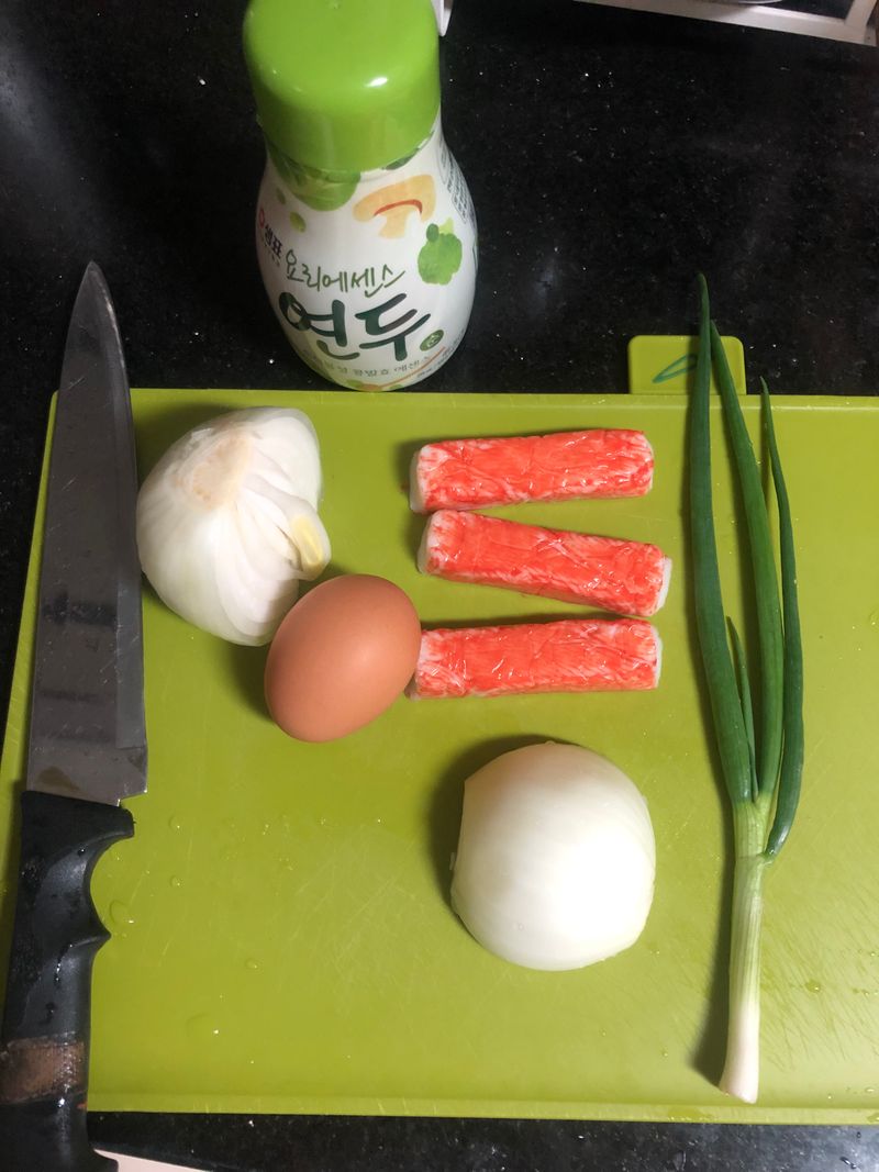 달걀2개, 물 550ml,양파 1/4개,쪽파1줄기,연두순3스푼,게살2개