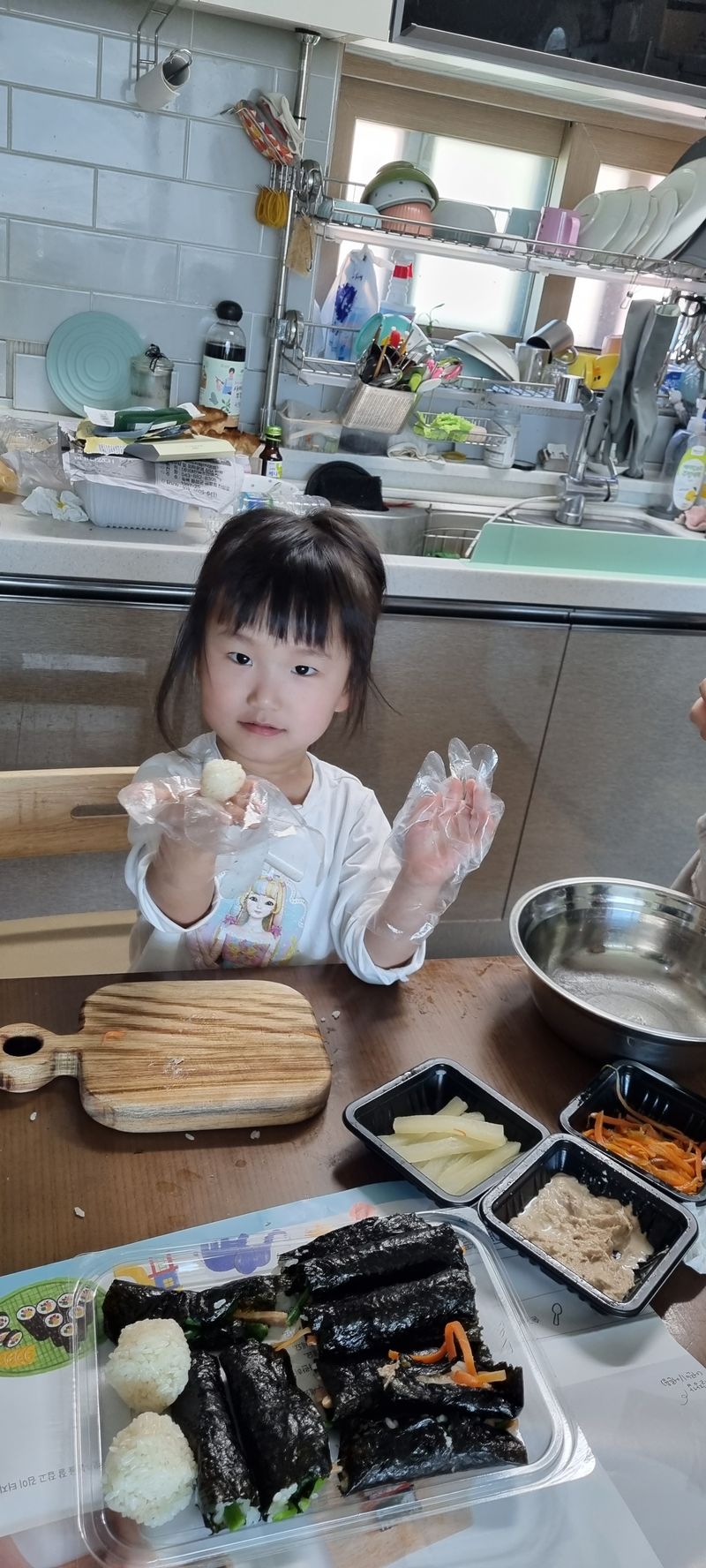 밥에 소금간이랑 깨뿌려서 아이들이 조물조물하고 야채랑 참치넣어서 돌돌말으면 완성^^♡