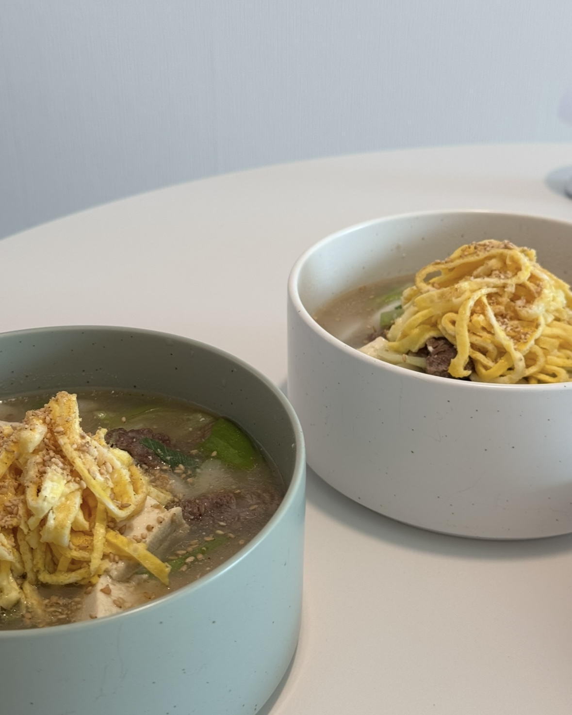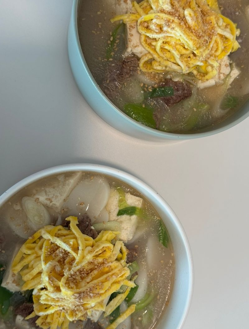 탄수화물이 빵빵한 떡국에 계란 지단을 듬뿍 올리고 두부를 송송 썰어 넣어 부족한 단백질을 보충했어요💛 📍(계란지단) 계란을 2개만 풀어도 한 장 이상 나와요! 📍떡국에 넣을 고기를 마늘과 함께 볶아서 풍미를 더해요!(+연두)
