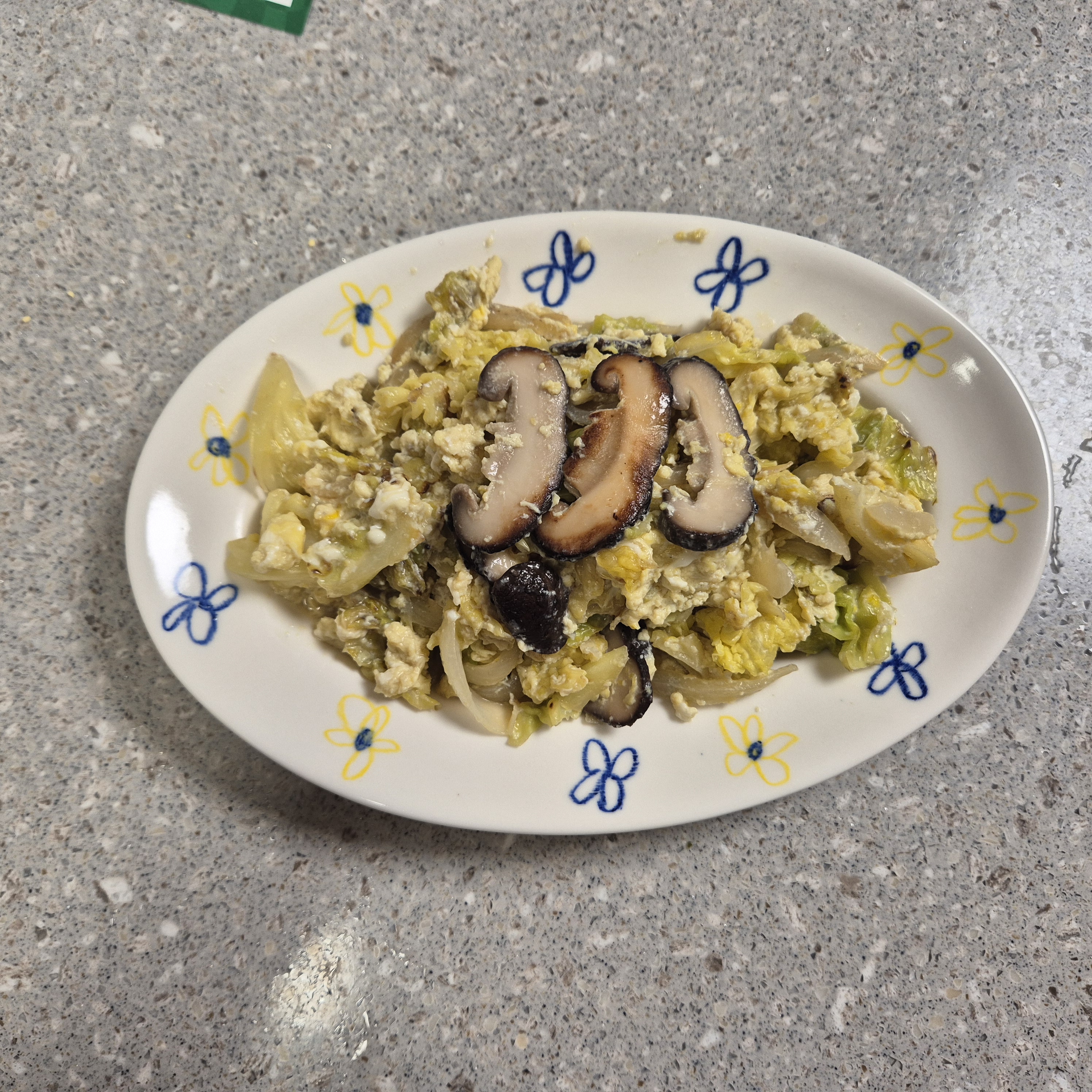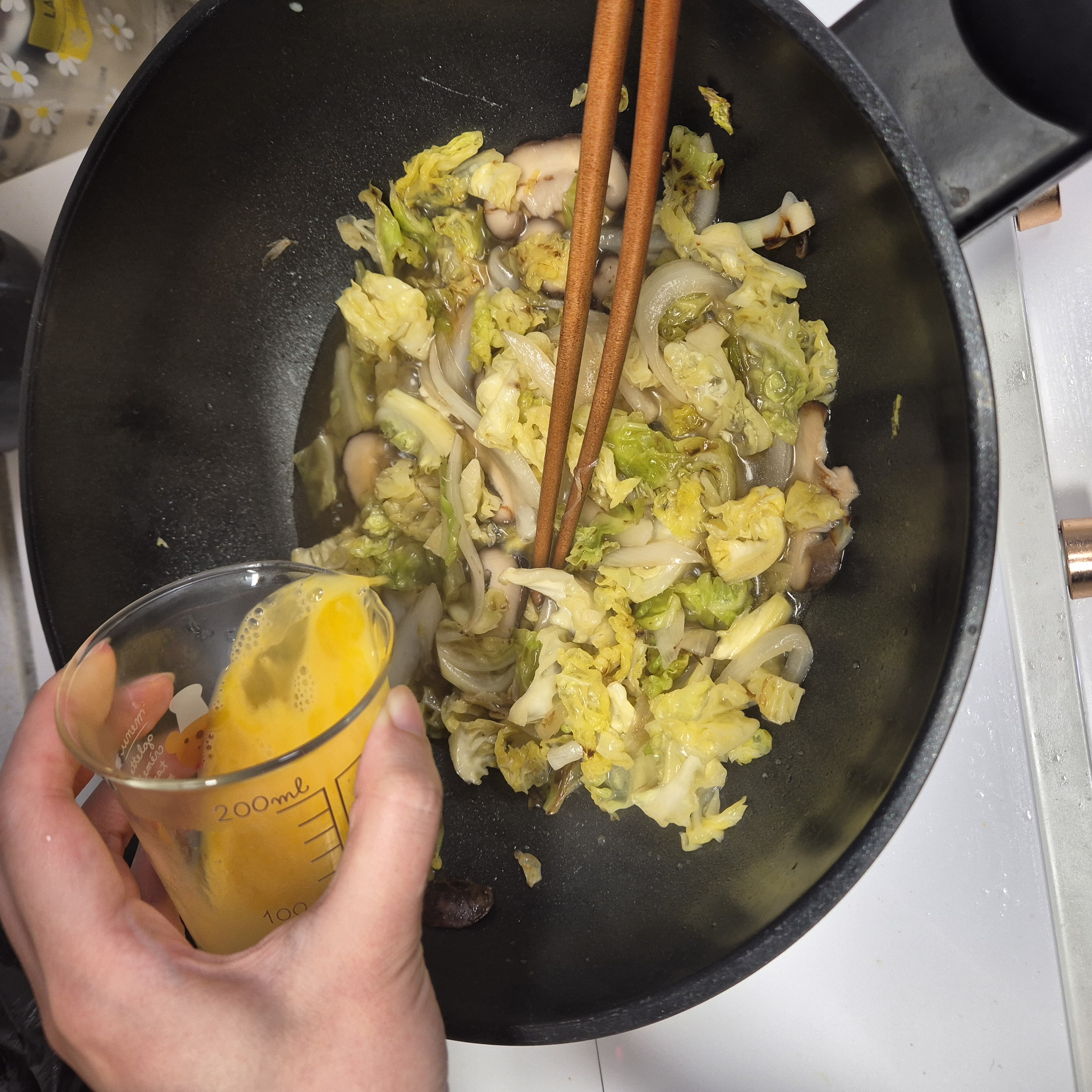 재료는 양파,양배추,표고버섯,계란2개,물150ml,연두순 한스푼,식용유 2스푼