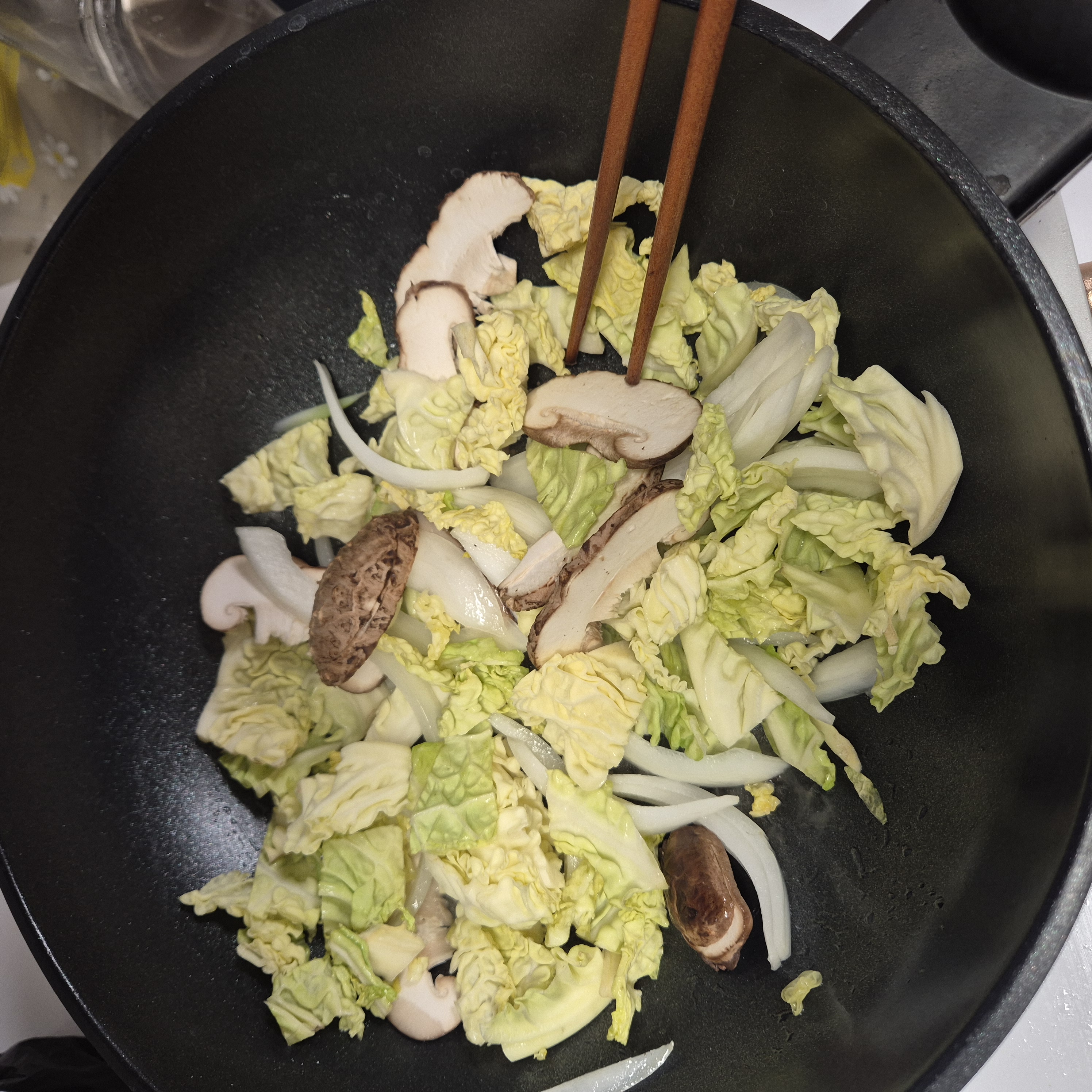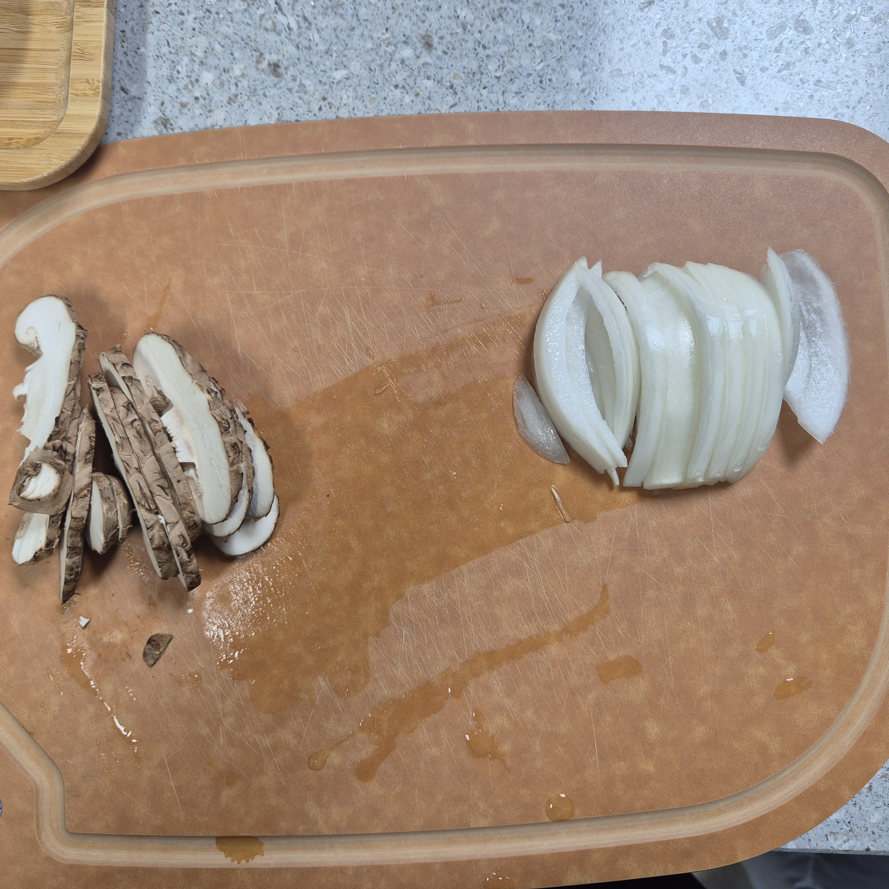밑둥을 제거한 표고버섯과 양파를 길게 썰어주고 양배추는 씹히는 식감을 더 느끼고 싶어서 네모나게 썰어줬어요