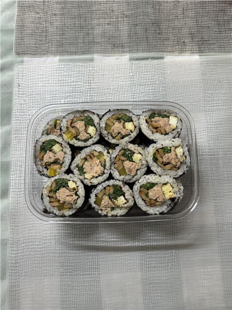 냉장고에 있는 재료로 김밥을 한가득 말았어요. 집 김밥은 그때그때 맛이 달라지는 게 재밌는 부분이죠. 반찬통에 담아서 식탁에 올려놓으면 온 가족이 출출할 때마다 한 알씩 꺼내 먹어요! 이제 날도 풀렸으니 김밥 들고 피크닉 나가야겠어요!