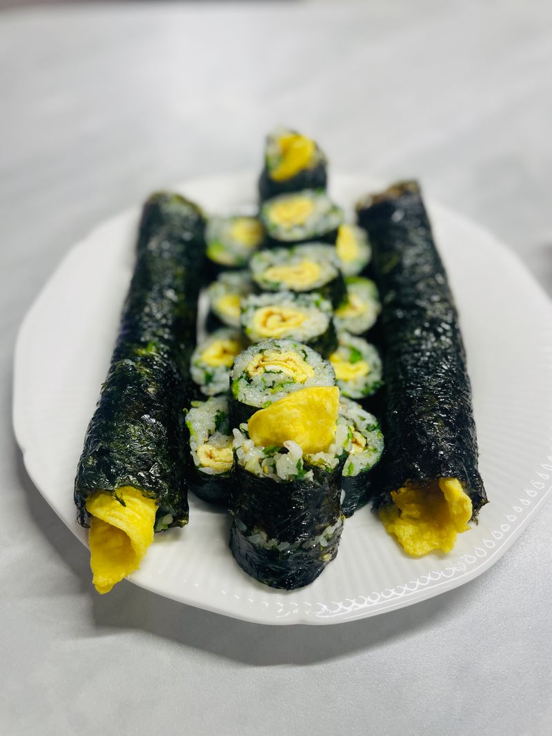 그 다음에 계란 지단을 부쳐서 김에 준비된 냉이밥과 함께 말아서 김밥을 만들어 보았어요