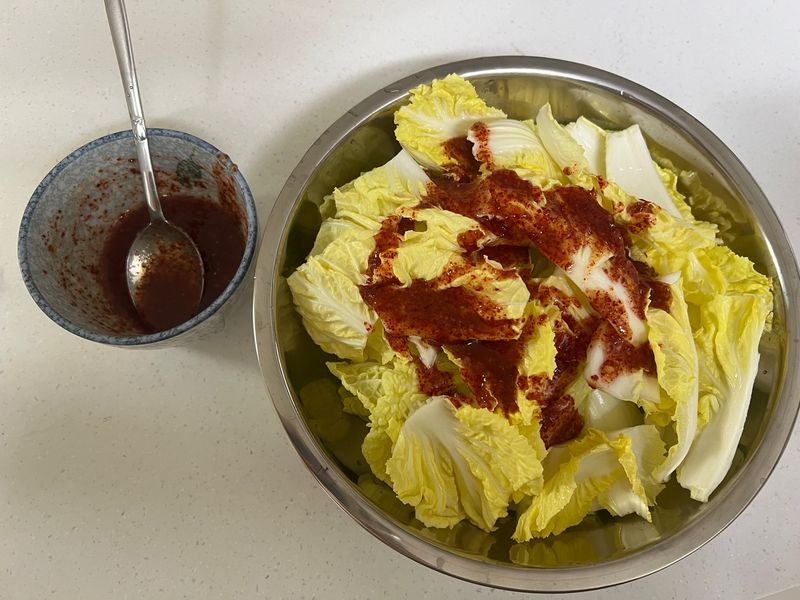 그 후 잘라진 알배추에 겉절이 소스를 넣어 조물조물 비벼주면 끝!