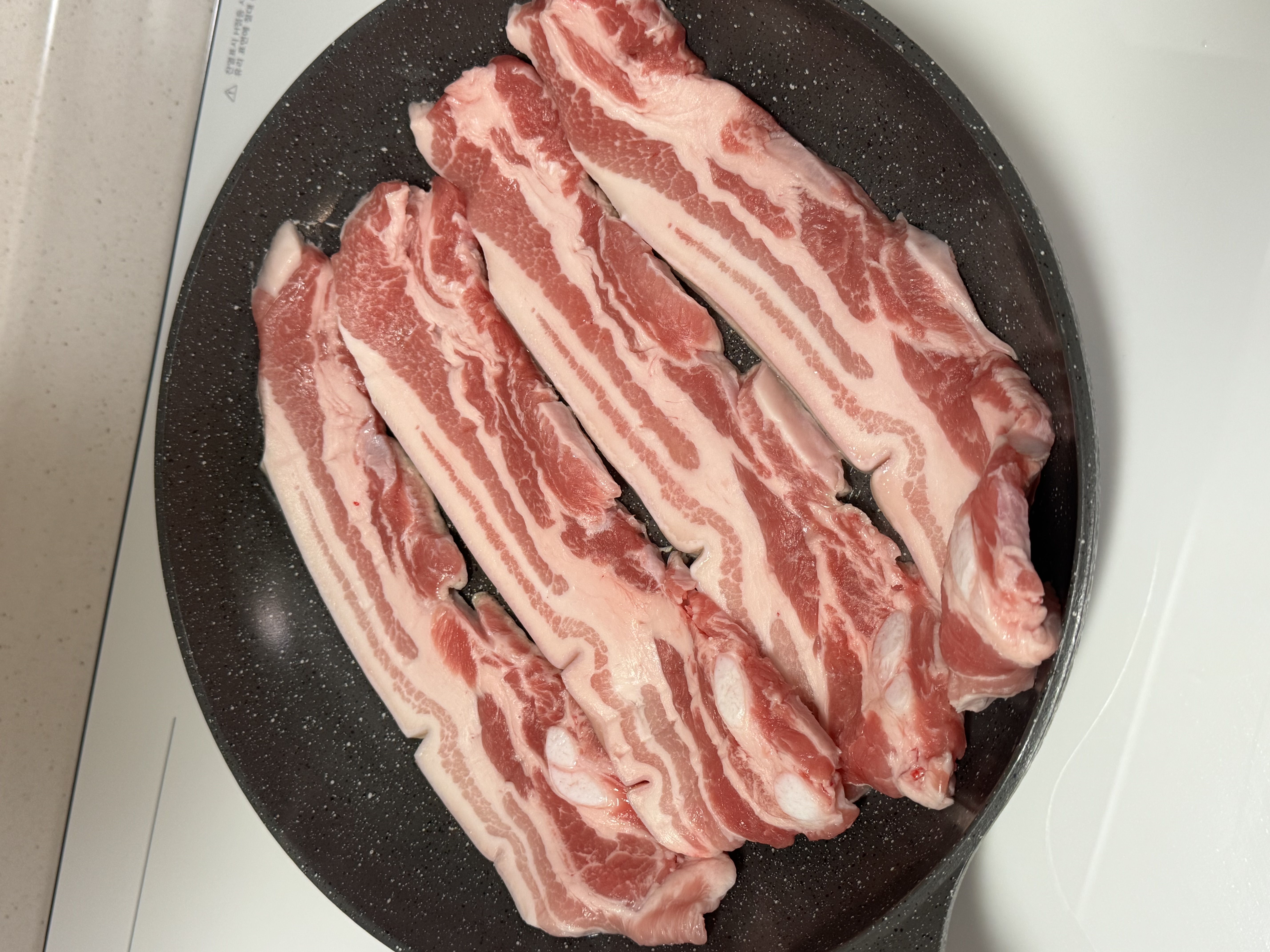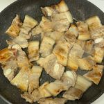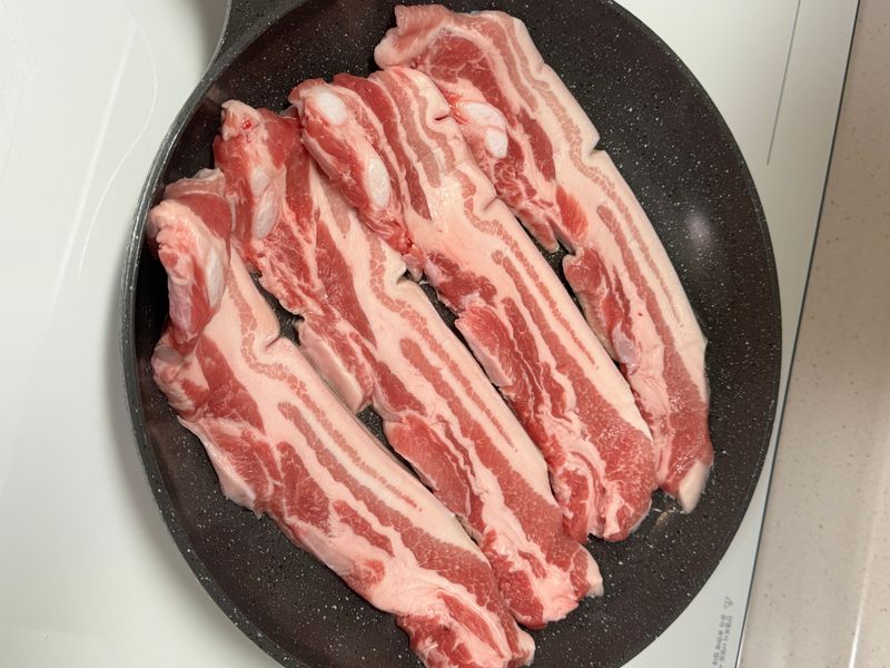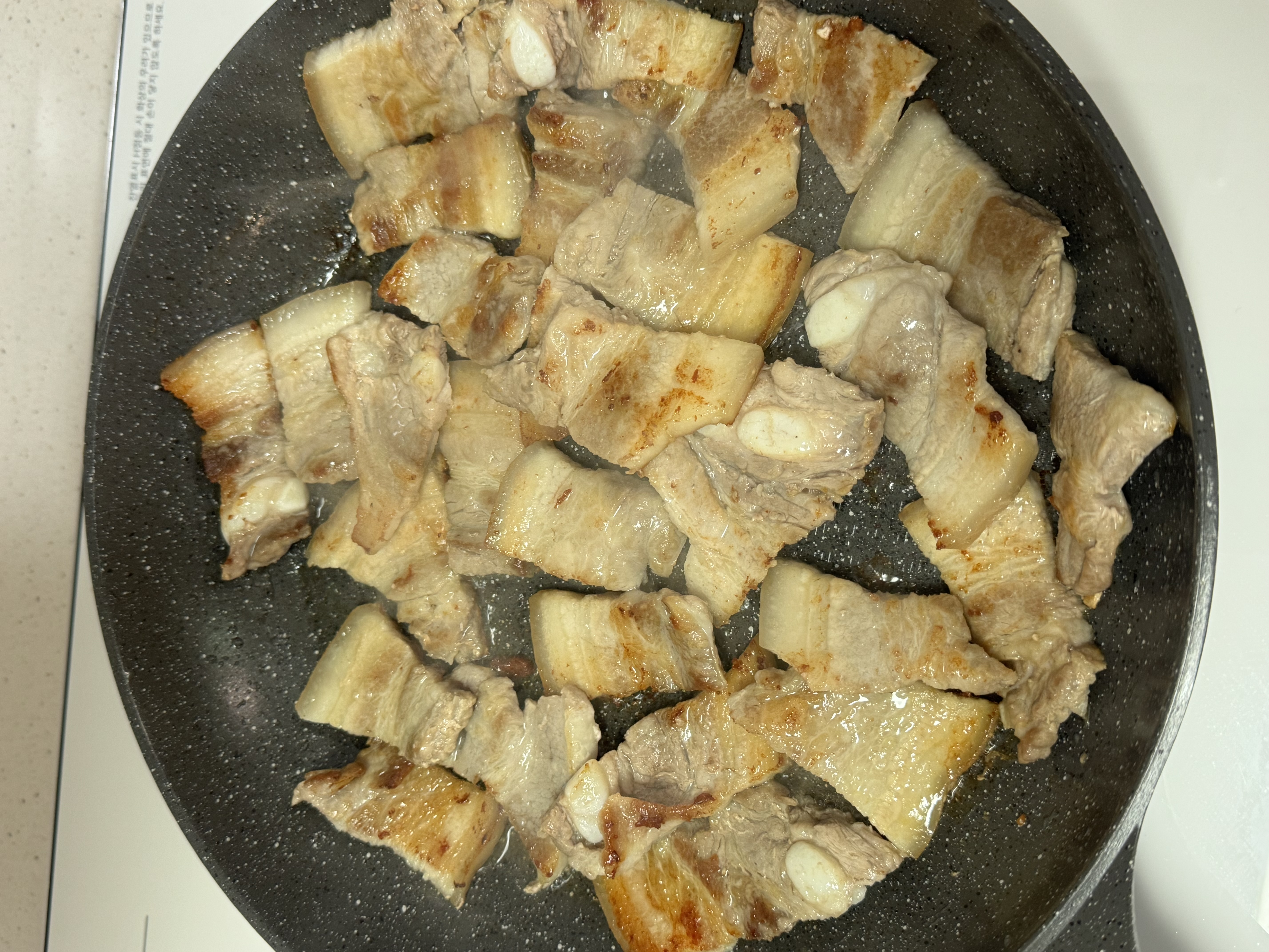 노릇해질때까지 삼겹살을 구워요! 잘라서 익히다가 차오차이 동파육 소스를 붓고 졸여줘요!