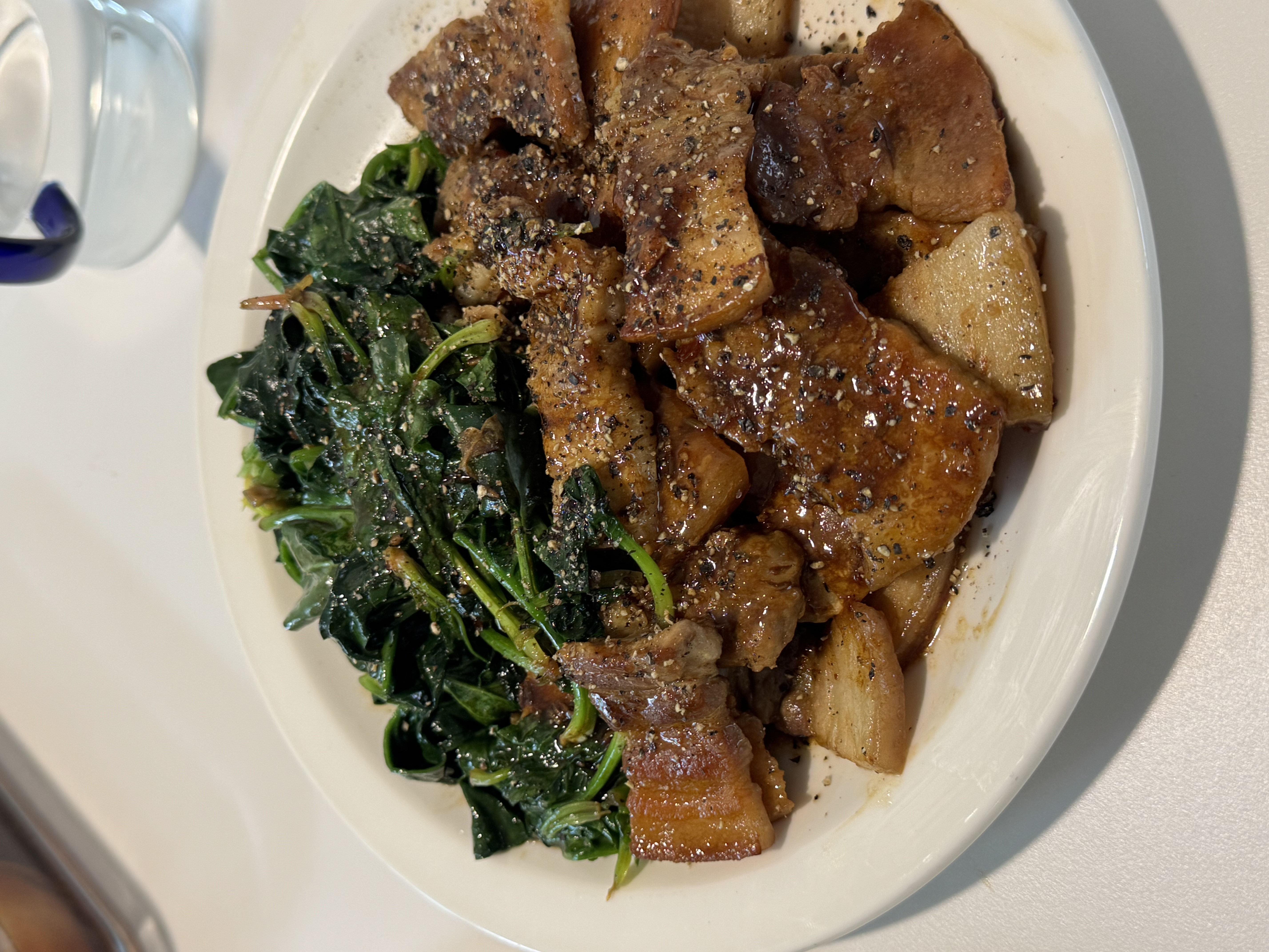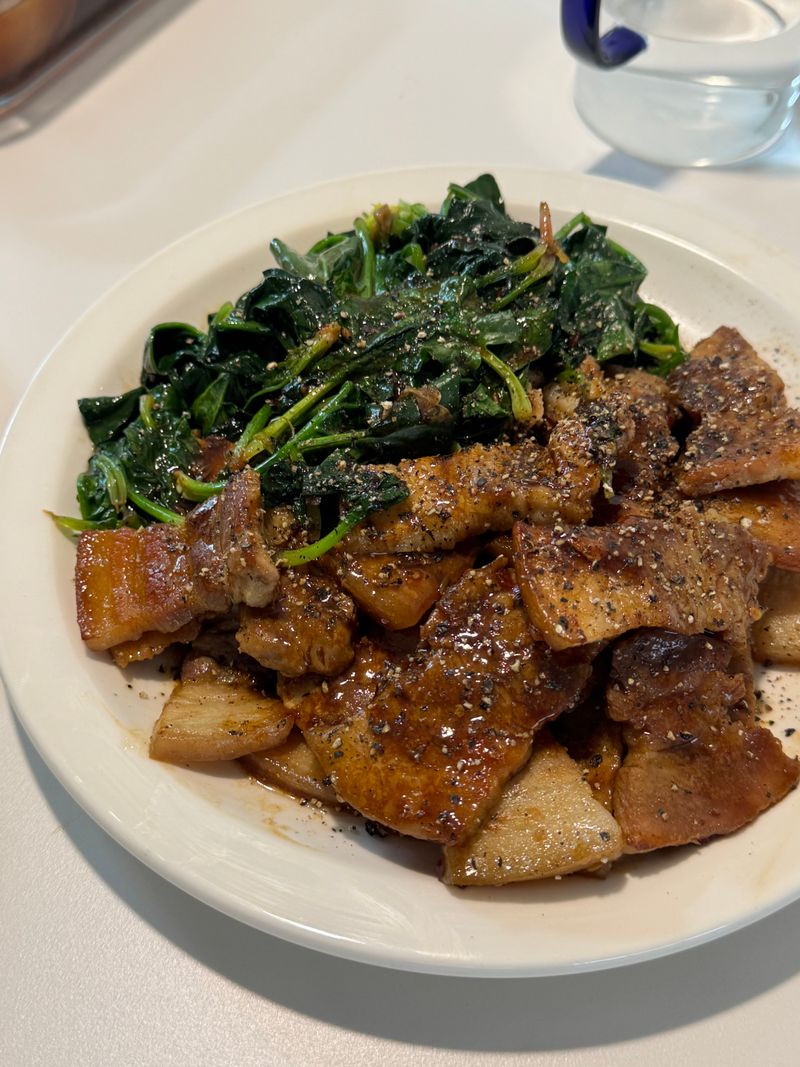 청경채를 구하지 못해 대신 제철 식재료인 시금치를 넣어서 동파육을 만들었어요! 간단하지만 메인 요리로 정말 좋았습니다. 짭짤한 차오차이 동파육 소스 간이 잘 베인 삼겹살과 시금치는 밥이랑도 정말 잘 어울렸어요!