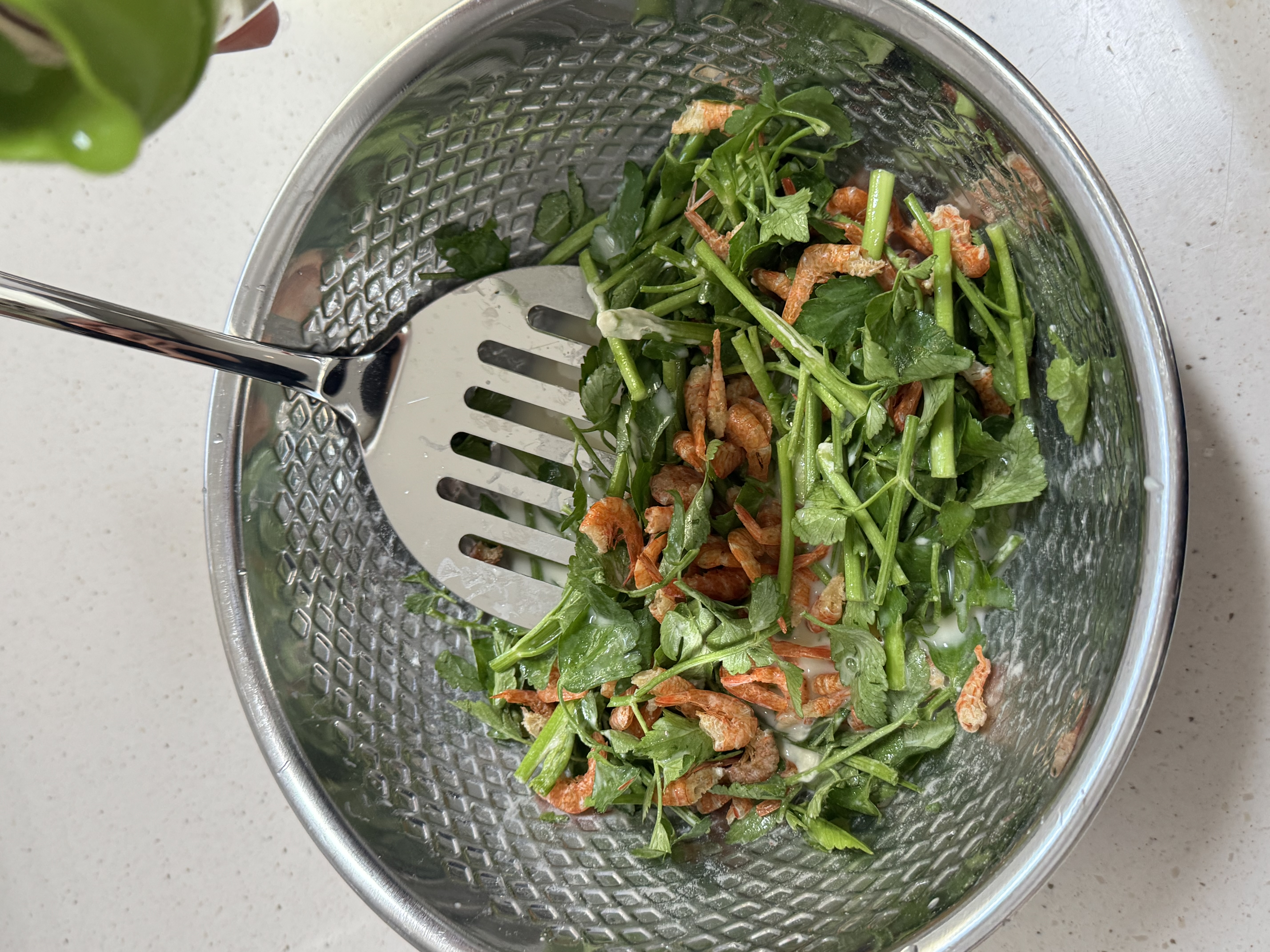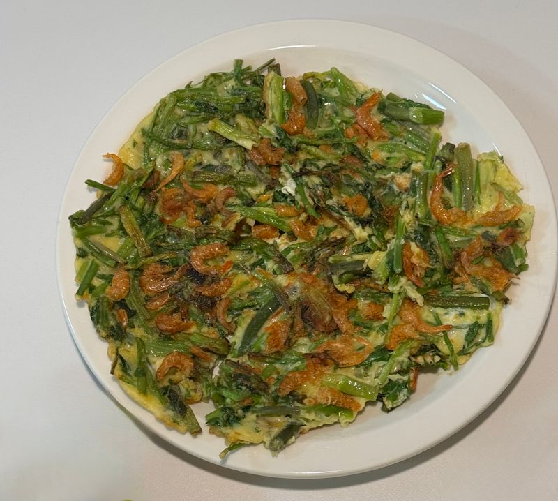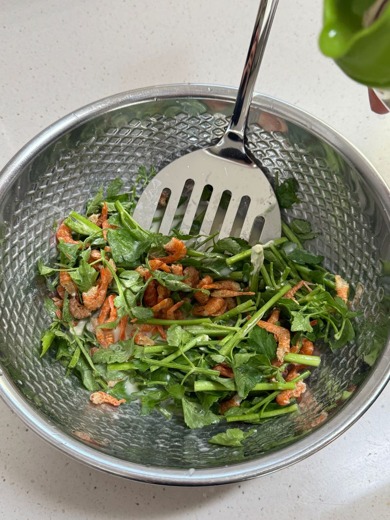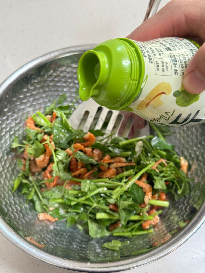 건새우의 바삭함과 미나리의 아삭함이 살아있는 미나리전이에요.