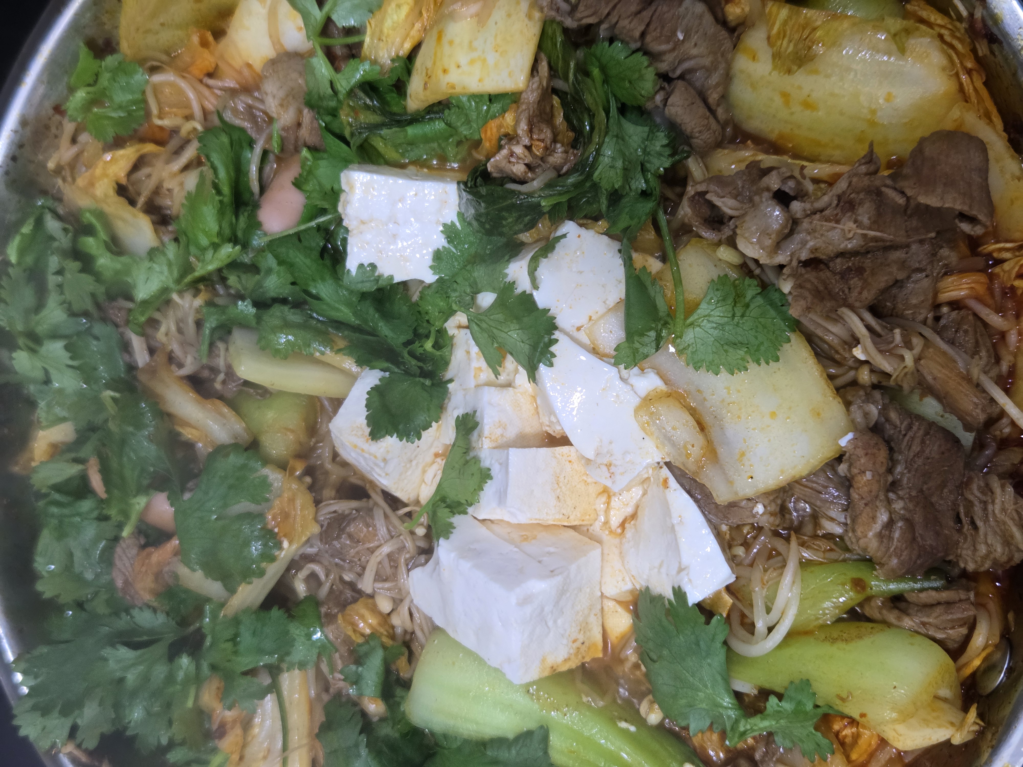 재료는 배추, 청경채, 팽이버섯, 숙주, 두부, 비엔나소세지, 대패삼겹살