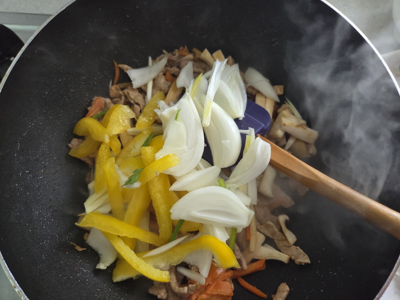팬을 예열한 후, 포도씨유를 두르고 고기와 채소를 넣어 볶아줍니다.