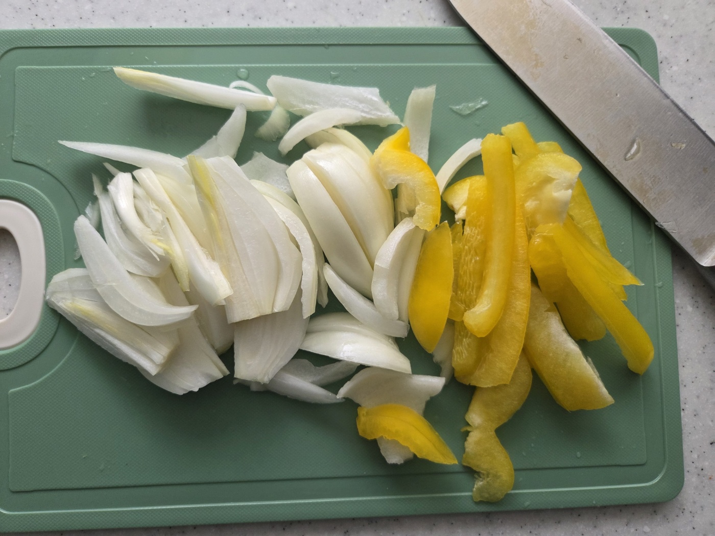 당근, 양파, 파프리카는 채 썰어주고, 미나리는 5cm 길이로 잘라줍니다.